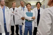 Das GeschenkDer Rotstift streicht immer noch durch die Gänge des Seattle Grace. Die Nerven liegen blank. Niemand weiß, wer als nächster rausfliegt: Charles (Robert Baker, l.), Owen (Kevin McKidd, 2.v.l.), Jackson (Jesse Williams, M.), Cristina (Sandra Oh, 2.v.r.) und Callie (Sara Ramirez, r.) ...Bild: © c 2009 American Broadcasting Companies, Inc. All rights reserved.