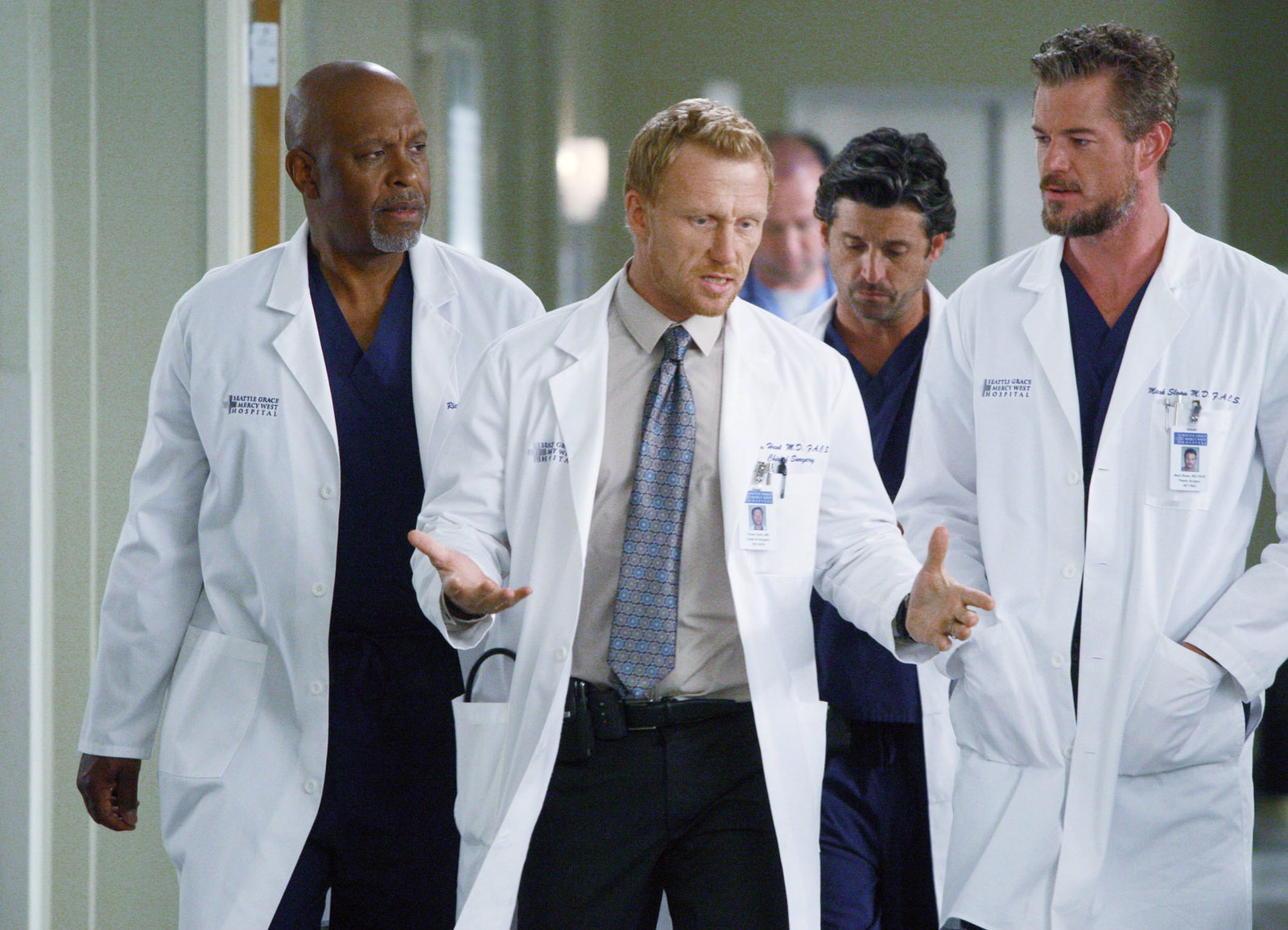 Was macht Männer aus?Zweifel an Owens Führungseignung: James Pickens Jr. als Dr. Richard Webber, Kevin McKidd als Dr. Owen Hunt, Patrick Dempsey als Dr. Derek Shepherd, Eric Dane als Dr. Mark SloanBild: © SRF/ABC Studios