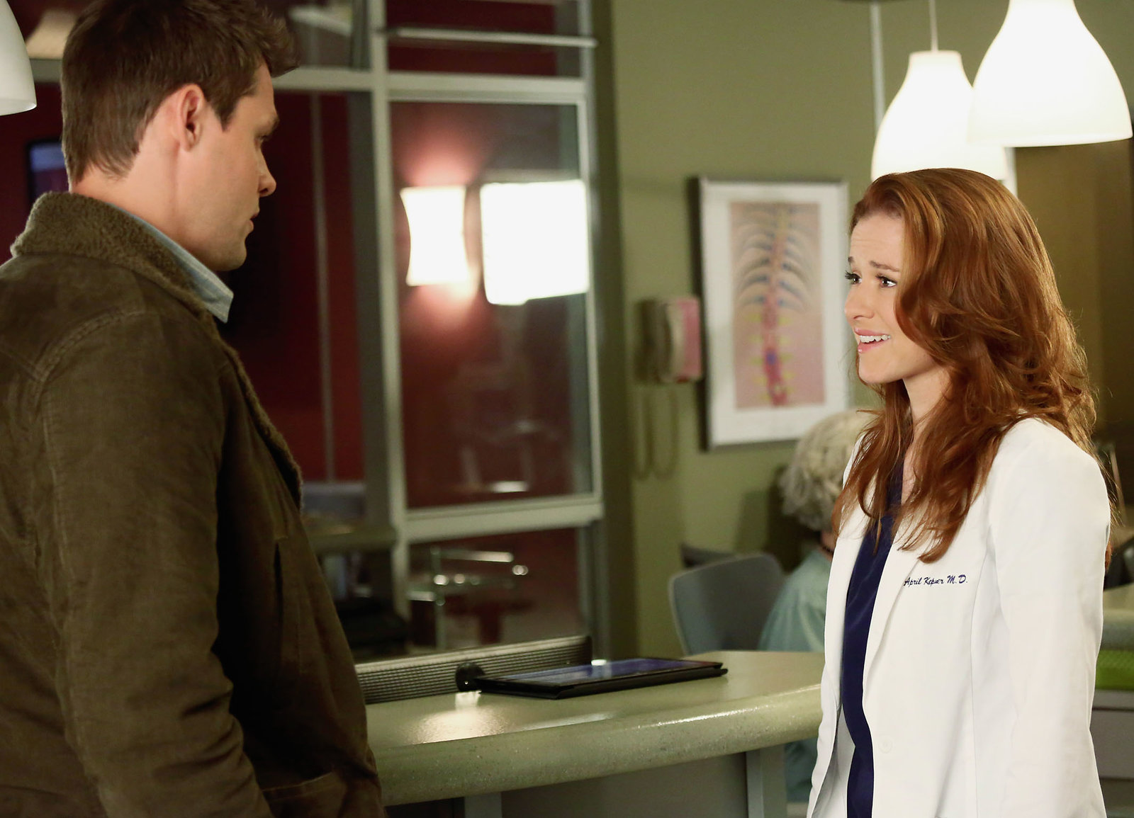 Das schlafende MonsterMatthew entschuldigt sich bei April: Justin Bruening als Matthew, Sarah Drew als Dr. April KepnerBild: © SRF/ ABC Studios