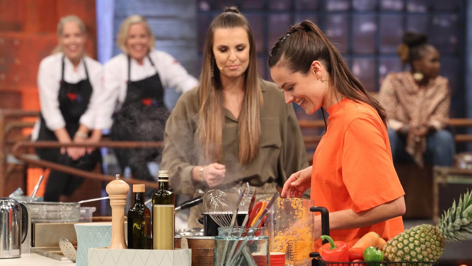 Folge 2V.l.: Star-Koch Steffen Henssler, Moderatorin Ruth Moschner, Antoine Monot Jr., Mirjam Weichselbraun, Sonja Zietlow und Kochcoach Mario KotaskaBild: © RTL / Frank W. Hempel