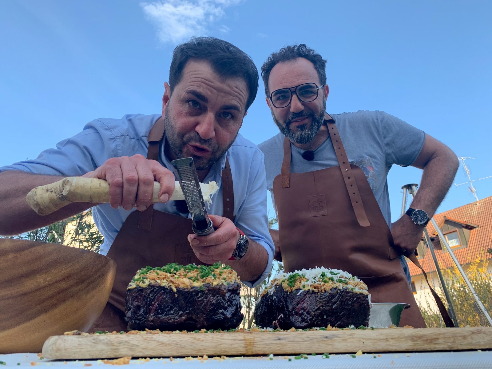 VegetarischAli Güngörmüş (vorne) reibt Kren über das Fleisch, während Adnan Maral zuschaut.Bild: © BR/Franziska Maral