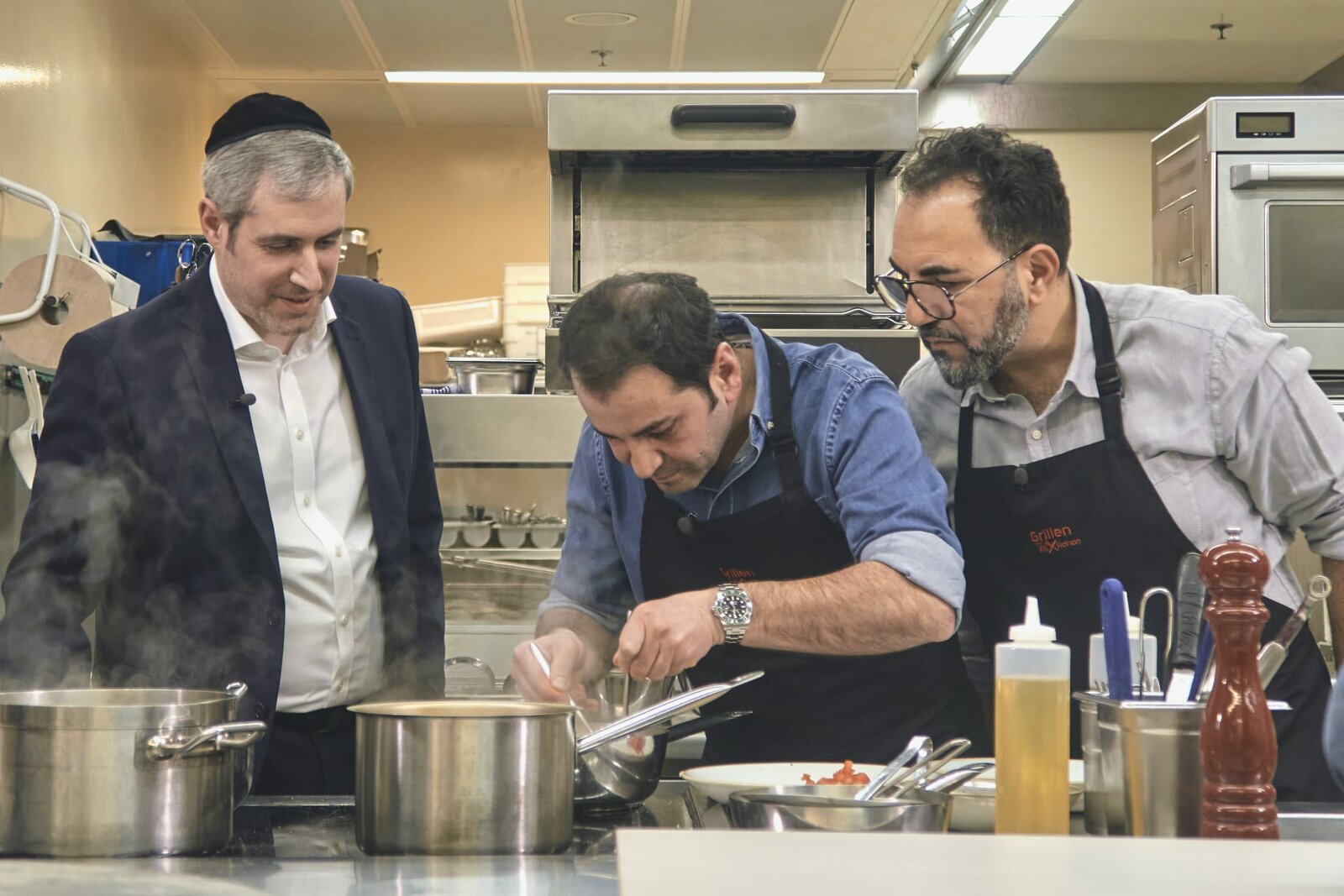 Koscher kochenVon links: Yaacov Sellem, Restaurantleiter des Einstein, Adnan Maral und Ali Güngörmüş bei der Speisezubereitung in der Küche.Bild: © BR / BR