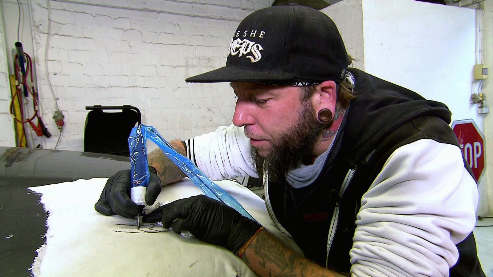 • Ein Auto tätowieren - geht das wirklich? GRIP begleitet ein einzigartiges Experiment. Tätowierer Mario versucht sich auf dem Leder...