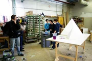 Volumen Kegel und PyramideGRIPS Mathe - Praxisbezug zur Berufswelt: Dreharbeiten in einer Möbelschreinerei zum Thema "Geometrische Körper". Das Volumen von Pyramiden versteht man am besten, wenn man sie selbst baut.Bild: © BR/Thomas Neuschwander
