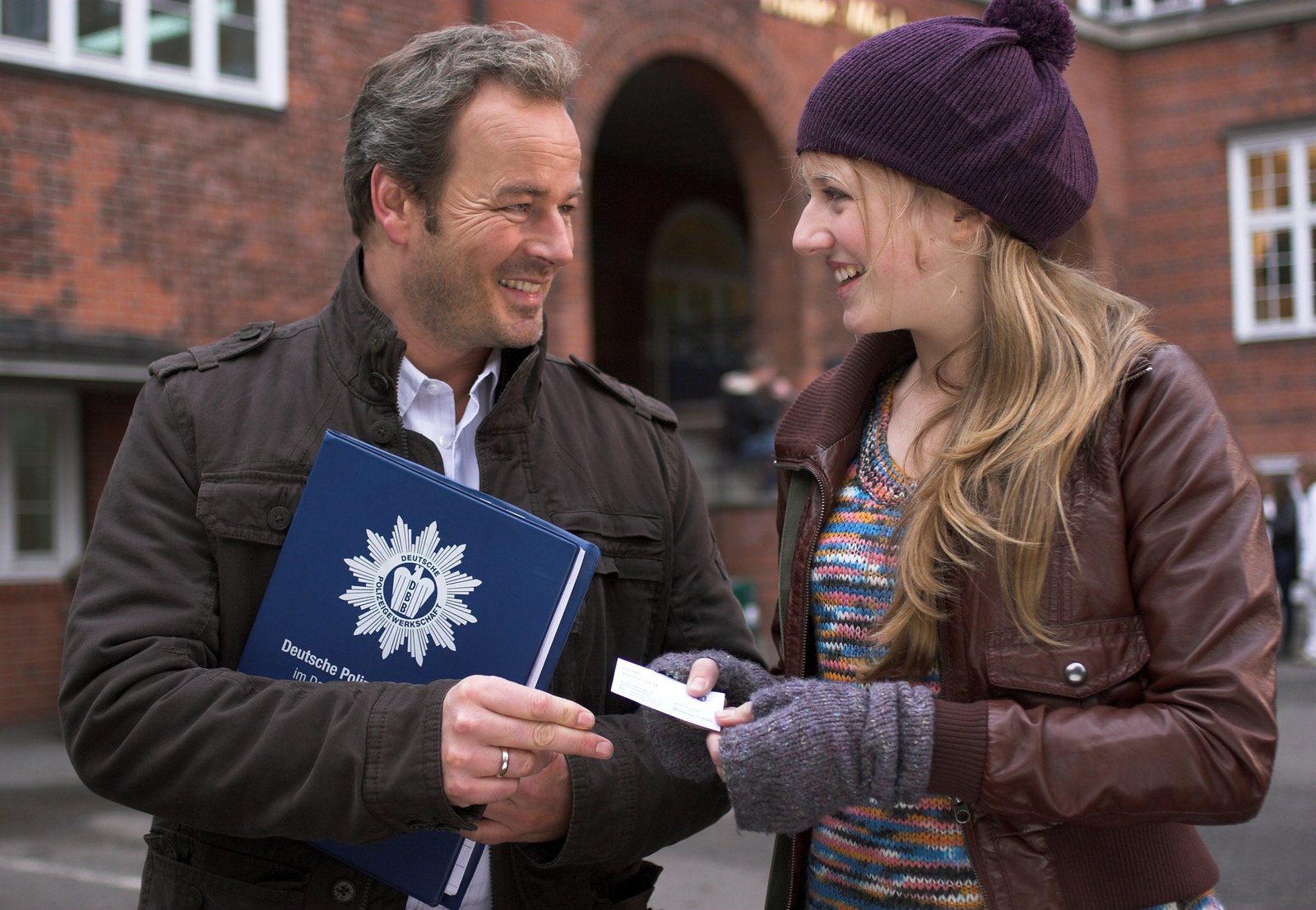 Alle für einenCop for you: Henning (Till Demtrøder, l.) gibt der Schülerin Rosa (Henriette Nagel, r.) seine Karte und verspricht ihr seine Hilfe.Bild: © ARD/Manju Sawhney