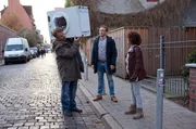 Das unsichtbare OrchesterWaschmaschinen-Diebstahl: Piet Wellbrook (Peter Fieseler, M.) und Harry Möller (Maria Ketikidou, r.) stellen den erschöpften Dieb Fiete Scheumann (Oliver Fleischer, l.) mit geschulterter Waschmaschine auf der Straße.Bild: © ARD/Thorsten Jander