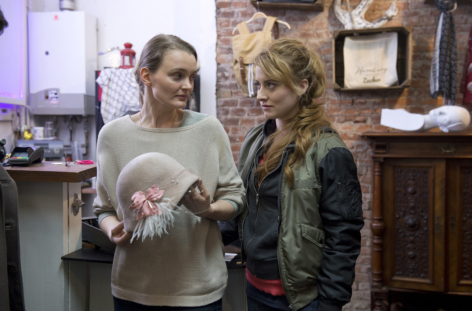 Der einsamste Wal der WeltEinbruch im Hutmachergeschäft - die Besitzerin Klara Wilmers (Birte Schnöink, l.) erklärt Nina Sieveking (Wanda Perdelwitz, r.), dass der Einbrecher sicher wieder der Junkie Niko Glanz war.Bild: © ARD/Thorsten Jander