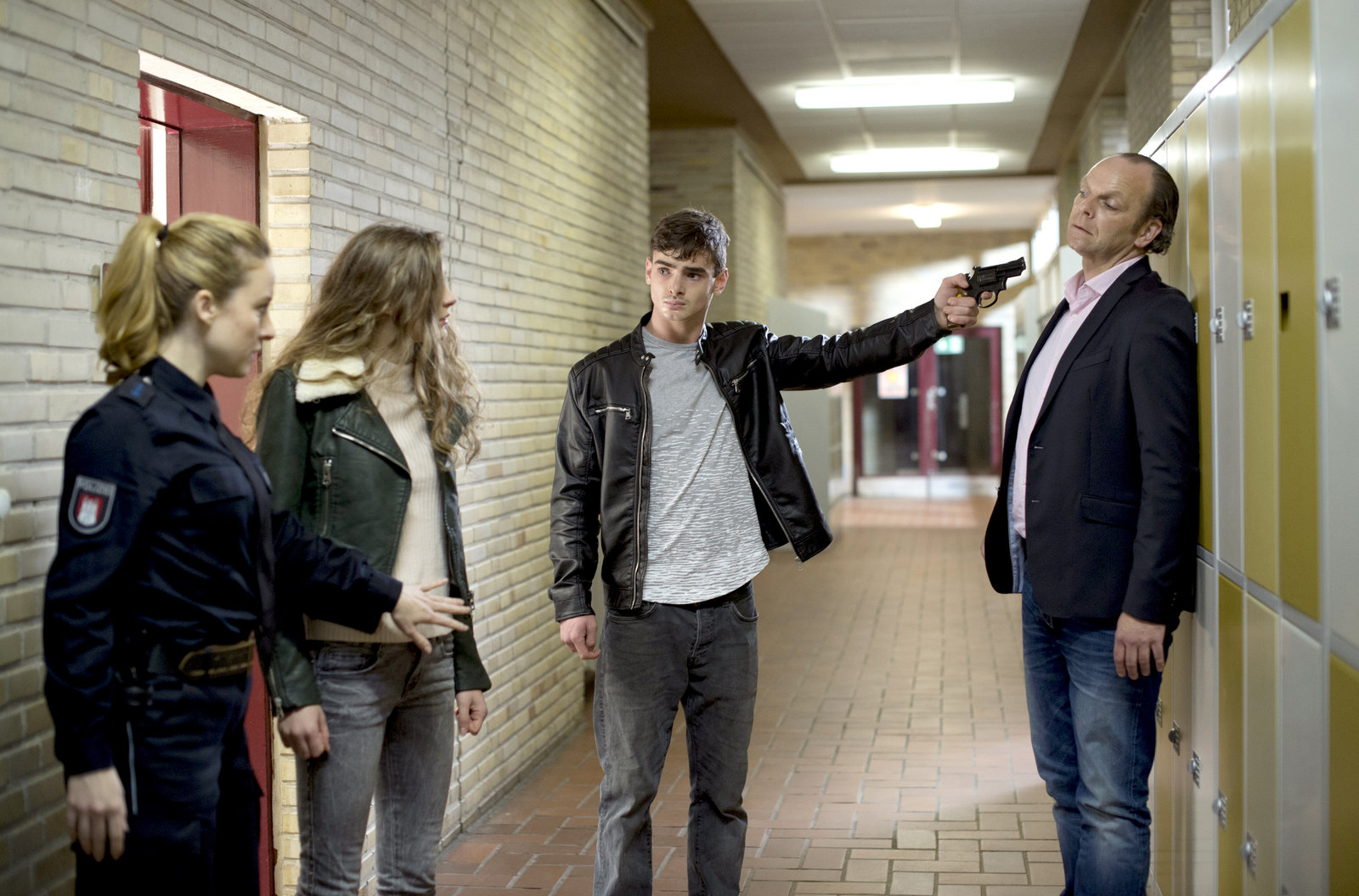 Hunde, die bellenGeiselnahme in einer Schule: Rupert Glasnig (Aaron Hilmer, 2.v.r.) droht damit, seinen ehemaligen Lehrer Jan Pfeiffer (Andreas Schröders, r.) zu erschießen. Doch dann bringt Nina Sieveking (Wanda Perdelwitz, l.) seine ehemalige Mitschülerin Clara (Rosmarie Röse, 2.v.l.) zu ihm.Bild: © ARD/Thorsten Jander
