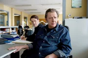 Die Aufsteiger des JahresPaul Dänning (Jens Münchow, l.) und Piet Wellbrook (Peter Fieseler, M.) statten dem ehemaligen Mitinhaber der Agentur Olaf Mallencke (Daniel Michel, r.) einen Besuch ab.Bild: © ARD/Thorsten Jander