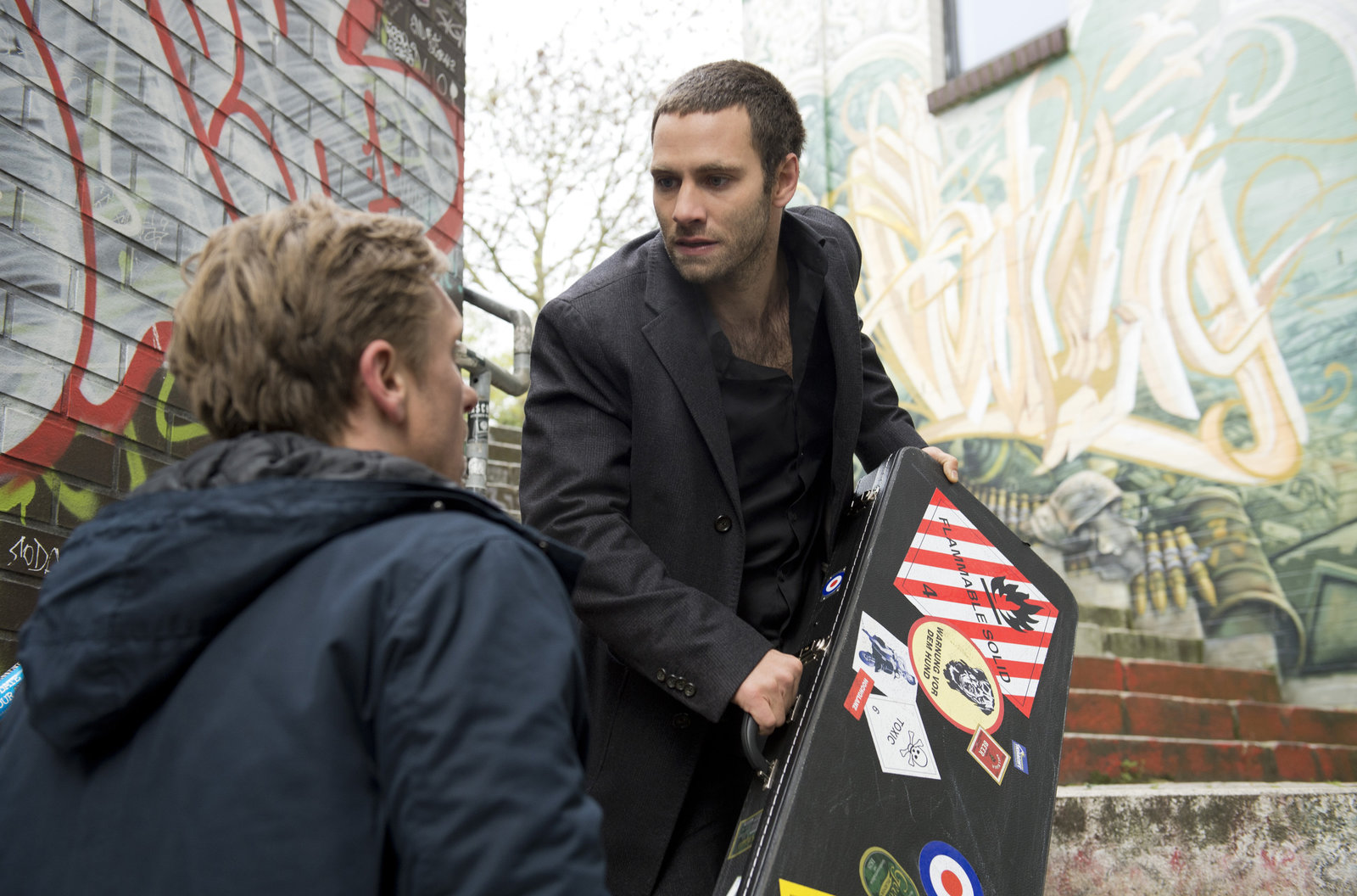 Das unsichtbare OrchesterPiet Wellbrook (Peter Fieseler, l.) stellt Dickie (Jonathan Müller, r.), der mit einem Gitarrenkoffer abhauen will.Bild: © ARD/Thorsten Jander