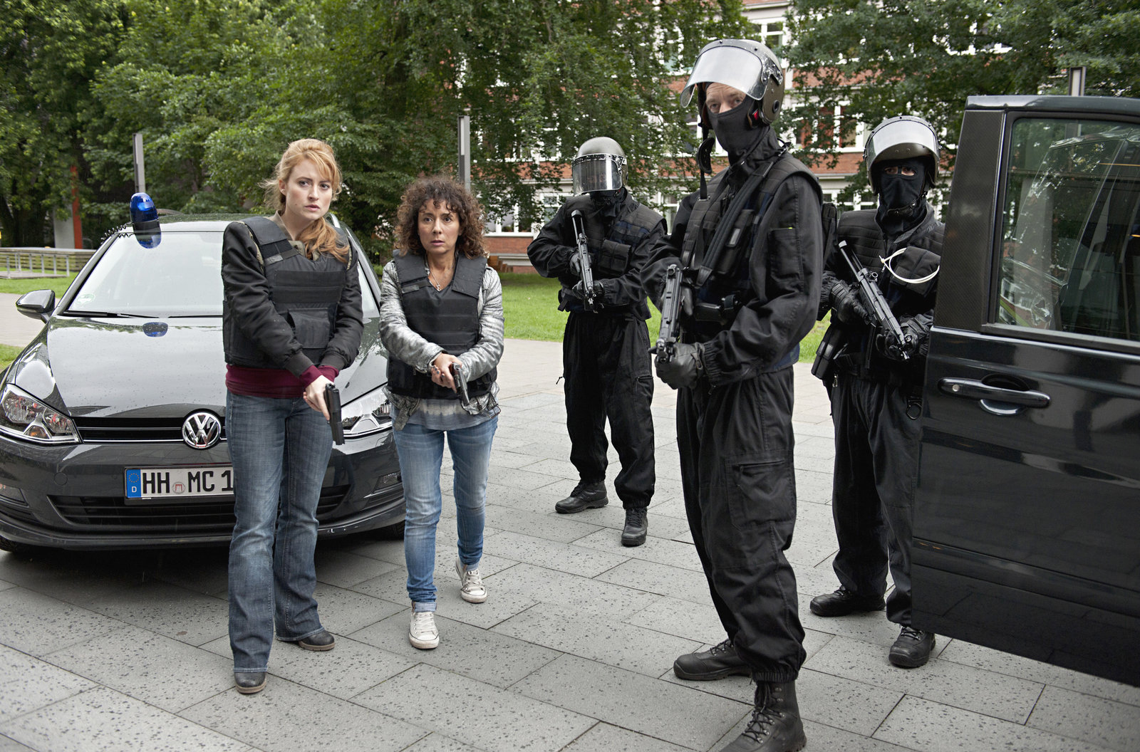 Dirks SorgenkindMEK Einsatz: Nina Sieveking (Wanda Perdelwitz, l.) und Harry Möller (Maria Ketikidou, 2v.l.) vor dem Bankgebäude.Bild: © ARD/Thorsten Jander