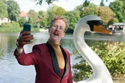 Duell auf der RennbahnRoderick Brüggemann (Uke Bosse) macht Selfies mit dem geklauten Schwanen-Tretboot.Bild: © ARD/Thorsten Jander
