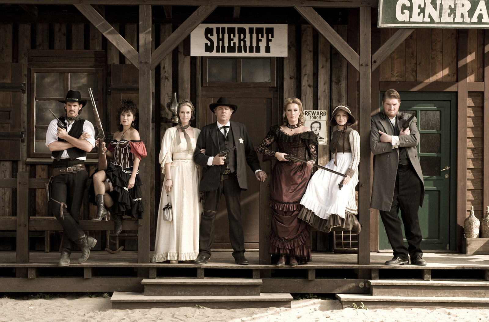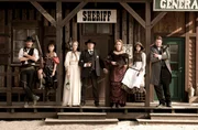 5 nach 12Großstadtrevier goes Western: die 300. Folge der Kultserie vom Hamburger Kiez wird als Western in Bad Segeberg inszeniert. (V.l.n.r.) Hilfssheriff Harvey (Steffen Groth), die schöne Tänzerin Harriet (Maria Ketikidou), Annie (Dorothea Schenck) und ihr Mann, Sheriff Clint (Jan Fedder), Saloonbesitzerin Rachel (Saskia Fischer), Nicki (Sophie Moser) und ihr Mann, der Bürgermeister Sam Hank (Marc Zwinz).Bild: © NDR/ARD/Thorsten Jander