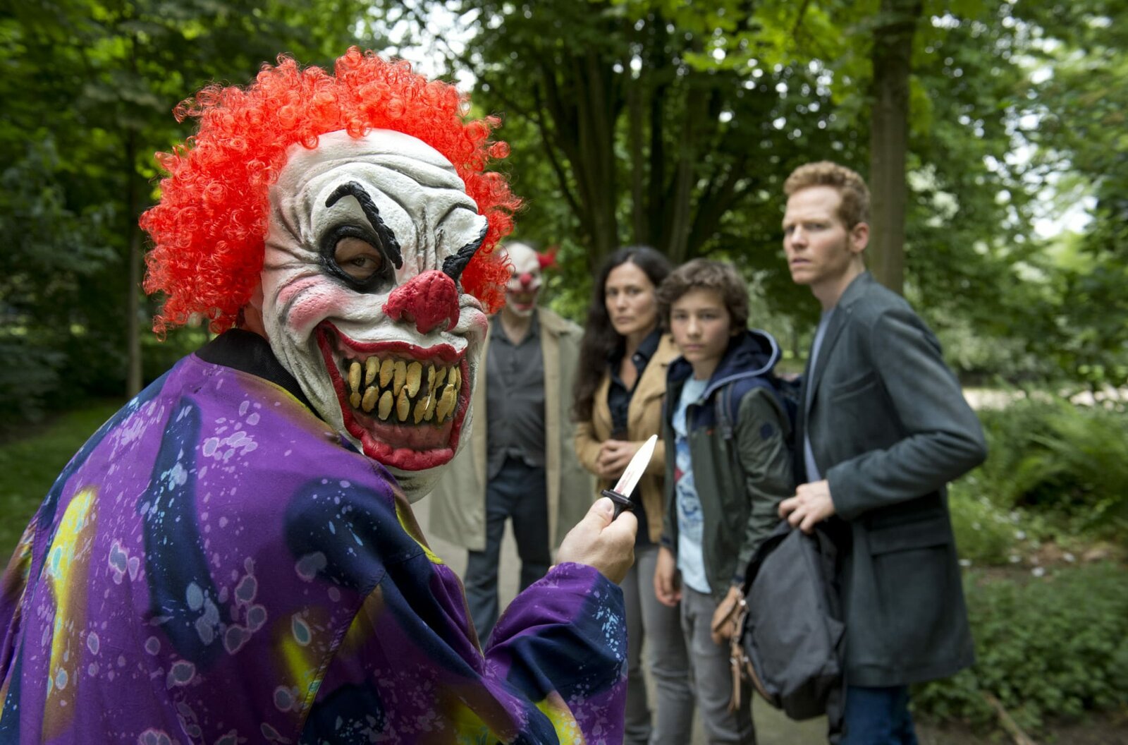 Das Lied vom HeldenÜberfall: Zwei Räuber mit Clownsmasken überfallen das Pop-Duo Tom und Elisa Best sowie ihren Sohn Ole. (V.l.n.r. Christian Kerepeski als Räuber, Komparse, Idil Üner als Elisa Best, Jann-Piet Puddu als Ole, Laurens Walter als Tom Best.Bild: © ARD/Thorsten Jander