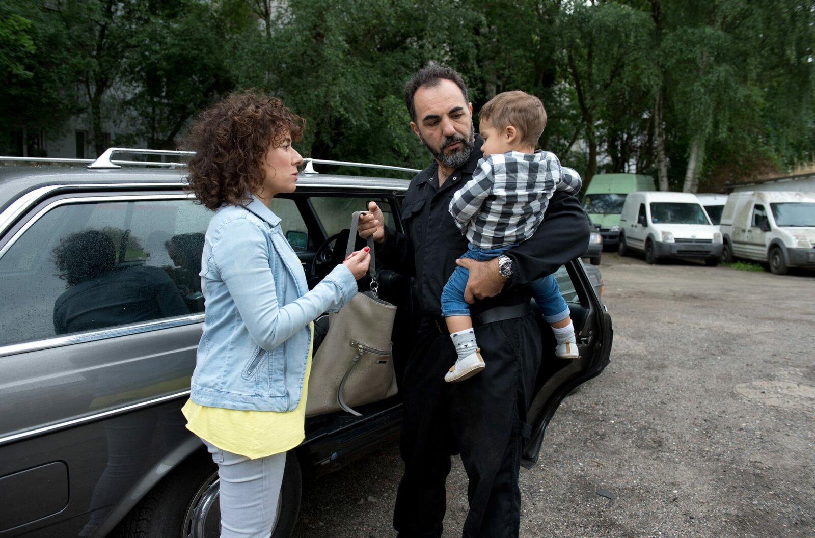 Harrys AussageHarry (Maria Ketikidou, l.) verabschiedet sich von ihrem Freund Can Topal (Adnan Maral, M.) und dem gemeinsamen Sohn Matthies. Die beiden sollen sich in Sicherheit bringen, bis sie ihre Aussage gemacht hat.Bild: © ARD/Thorsten Jander