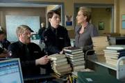 Im ZweifelSonderauftrag von Frau Küppers (Saskia Fischer, r.) für Hannes Krabbe (Marc Zwinz, l.) und Daniel Schirmer (Sven Fricke, M.): sie müssen kartonweise Bücher aus der Universitätsbibliothek auf Amphetamine durchsuchen.Bild: © MDR/ARD/Thorsten Jander