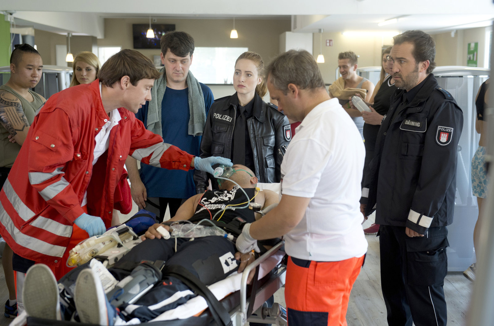 Daniel in der LöwengrubeEin Bodybuilder ist im Fitness-Studio zusammengebrochen. Daniel Schirmer (Sven Fricke, 2.v.l.), Nina Sieveking (Wanda Perdelwitz, 3.v.l.) und Paul Dänning (Jens Münchow, r.) warten auf die Diagnose von Notarzt Dr. Herzog (Philip Schwarz, l.).Bild: © ARD/Thorsten Jander