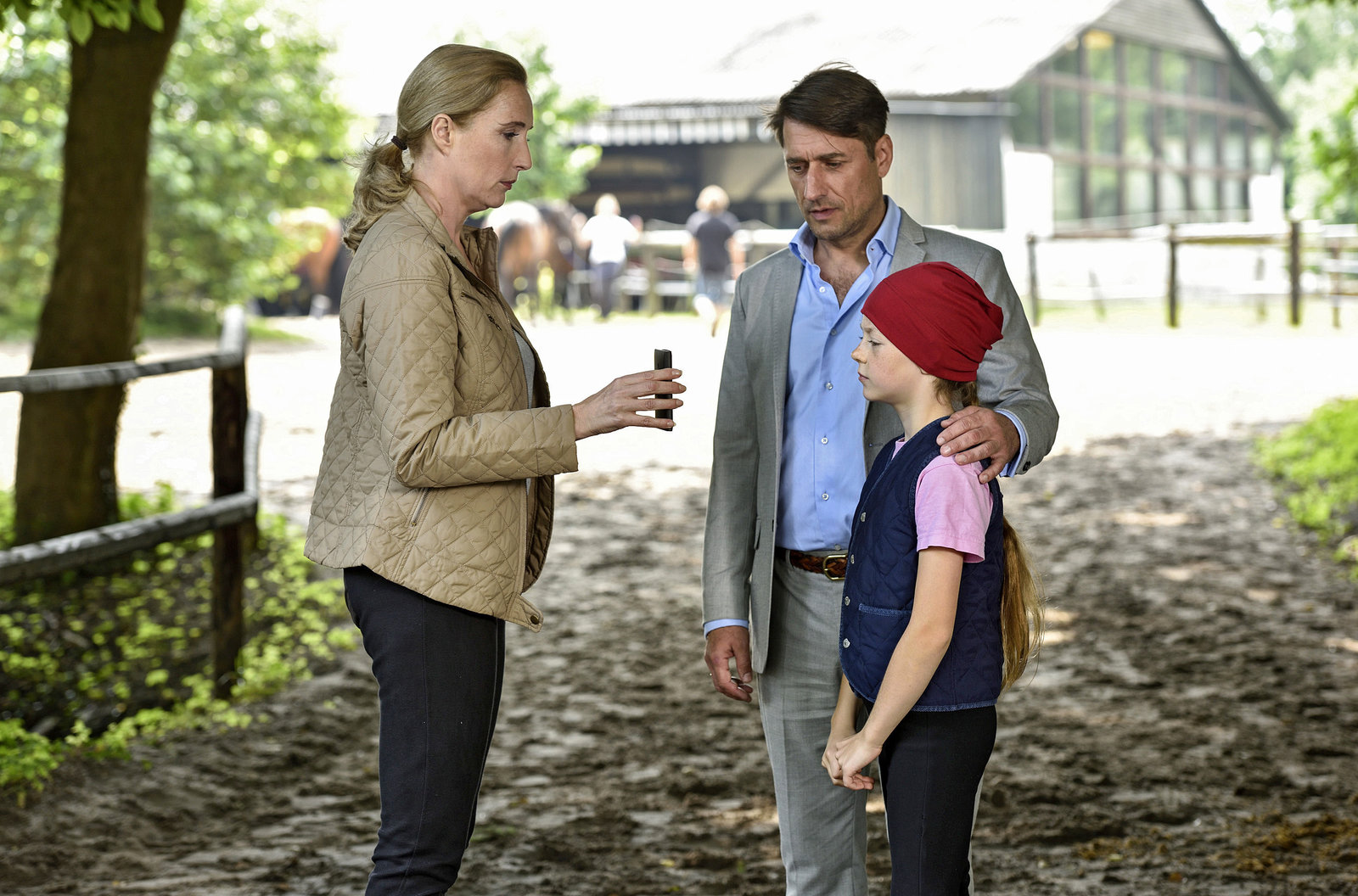 Die WölfinKommissariatsleiterin Küppers (Saskia Fischer, l.) lernt auf dem Reiterhof die kleine Emma (Gwendolyn Göbel, r.) kennen, die fest davon überzeugt ist, dass die Wölfin ihr Pferd verscheucht hat. Im Beisein ihres Vaters Hartwig Rohde (Stephan Bürgi, M.) zeigt Frau Küppers Beweisfotos, die eine ganz andere Geschichte erzählen.Bild: © ARD/Markus Hertrich