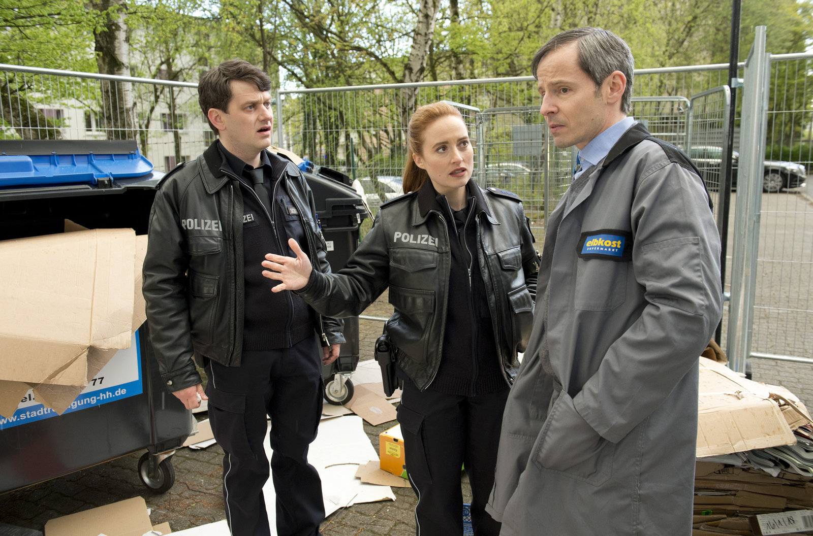 Die MüllmafiaSupermarktleiter Ingo Neuer (Matthias Bundschuh, r.) hat Strafanzeige gestellt wegen Diebstahls und Hausfriedensbruch. Er zeigt Nina Sieveking (Wanda Perdelwitz, M.) und Daniel Schirmer (Sven Fricke, l.) die durchwühlten Müllcontainer seiner Filiale.Bild: © ARD/Thorsten Jander