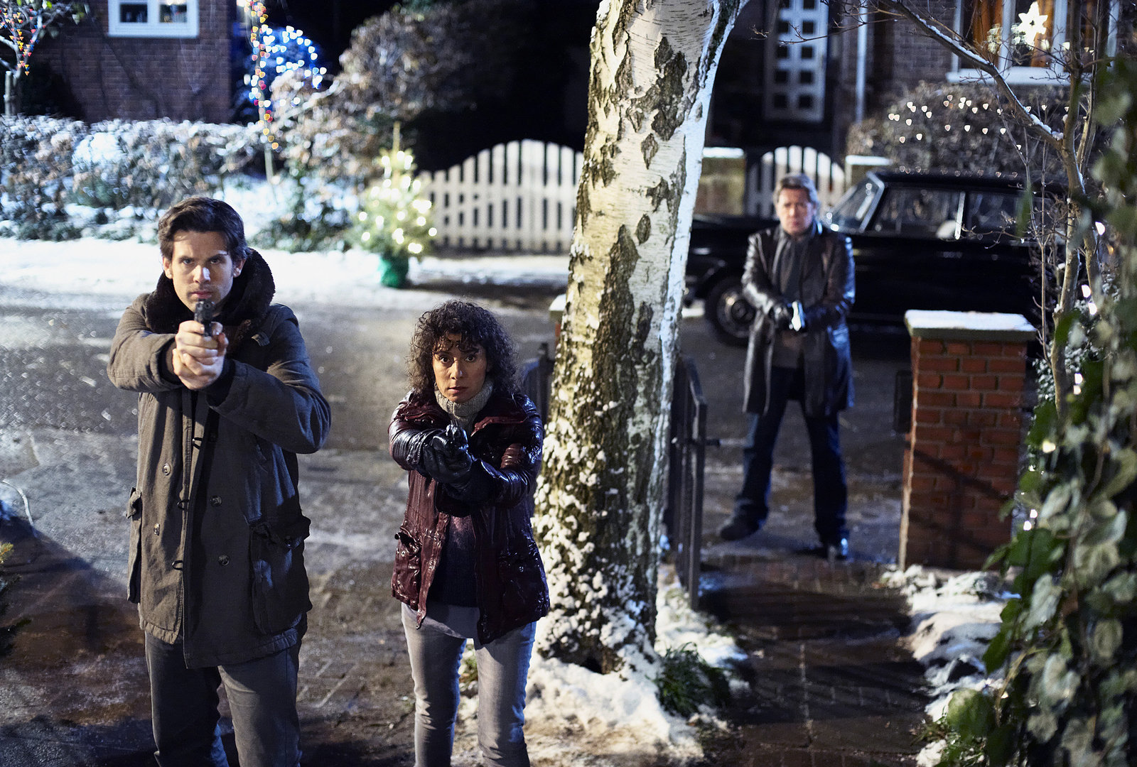 Frohe Weihnachten Dirk Matthies (2)Dramatischer Einsatz am Weihnachtsabend: Harry (Maria Ketikidou, M.), Hauke (Steffen Groth, l.) und Dirk Matthies (Jan Fedder, r.) haben auf den Jugendlichen Tim angelegt, der mit einer Waffe auf seine ehemalige Lehrerin zielt.Bild: © ARD/Sandra Hoever