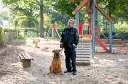 Hunde, die bellenPaul Dänning (Jens Münchow) sammelt auf dem Spielplatz einen streunenden Wachhund auf und legt ihm einen Maulkorb an.Bild: © ARD/Thorsten Jander
