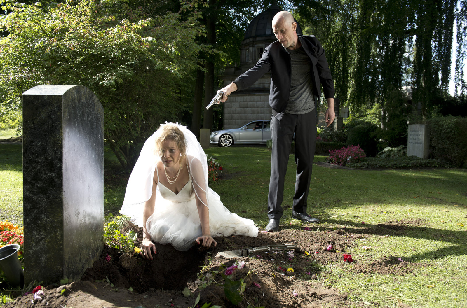 Braut mit VorlebenDer brutale Gangster Marco Hanka (Sebastian Haase, r.) führt Braut Melania (Angelina Häntsch, l.) mit vorgehaltener Pistole zum Grabstein ihrer Großmutter, wo sie seine Drogenbeute versteckt hat. Doch das Geld ist nicht da.Bild: © ARD/Thorsten Jander / ARD-Programmdirektion