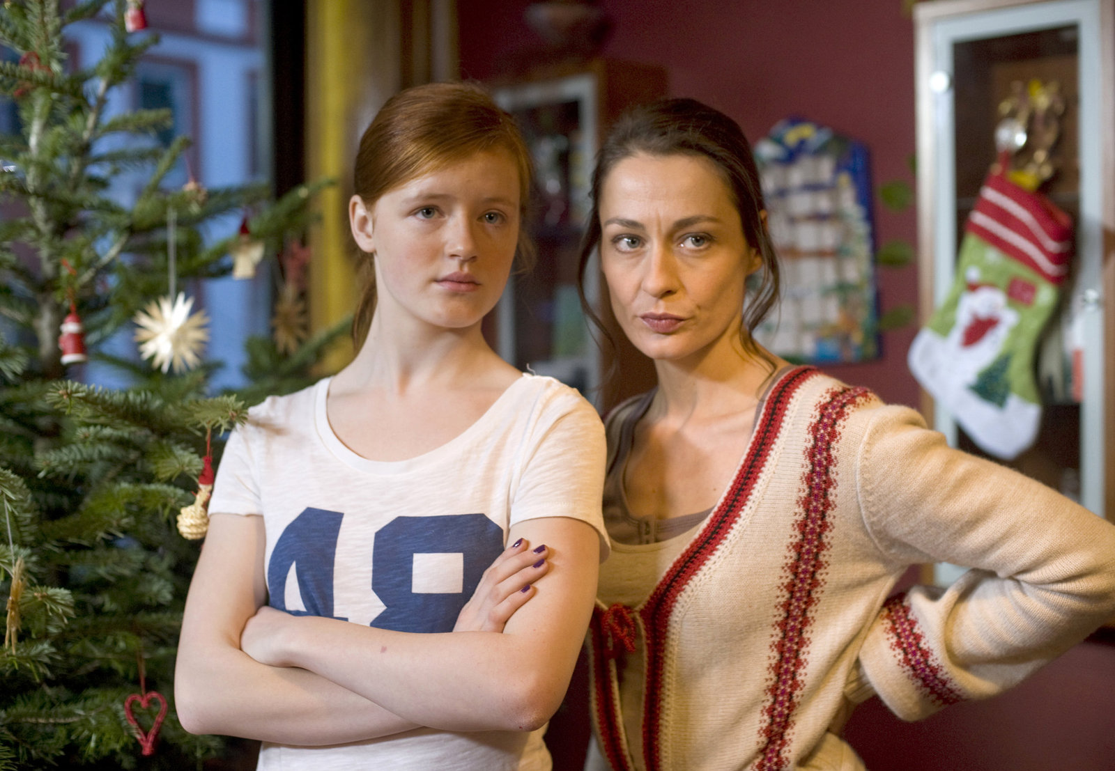 Frohe Weihnachten Dirk Matthies (1)Emily Teichert (Pauline Fuchs, l.) und ihre Mutter Miriam (Antonia Gerke, r.) leugnen zunächst, dass in ihrer Wohnung ein lautstarker Familienstreit stattgefunden hat.Bild: © ARD/Thorsten Jander