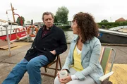 Harrys AussageHarry (Maria Ketikidou, r.) zweifelt, ob sie angesichts der Bedrohung ihrer Familie wirklich eine Aussage machen soll. Sie besucht Dirk Matthies (Jan Fedder, l.) auf der Repsold und fragt ihn um Rat.Bild: © ARD/Thorsten Jander
