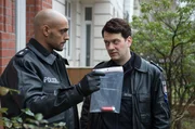 Auge um AugeLukas Petersen (Patrick Abozen, l.) hat im Vorgarten ein Beweisstück gefunden. Er ahnt nicht, dass der Lippenstift seinen Kollegen Daniel Schirmer (Sven Fricke, r.) in Schwierigkeiten bringen wird.Bild: © ARD/Thorsten Jander