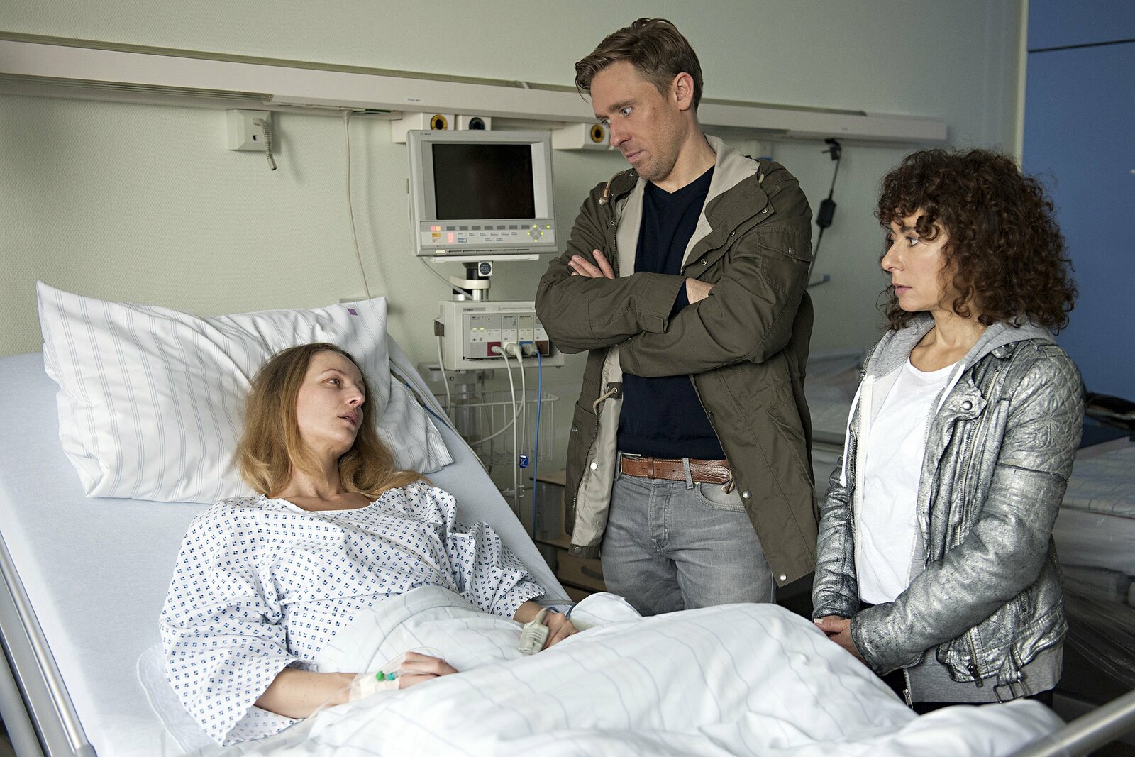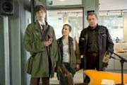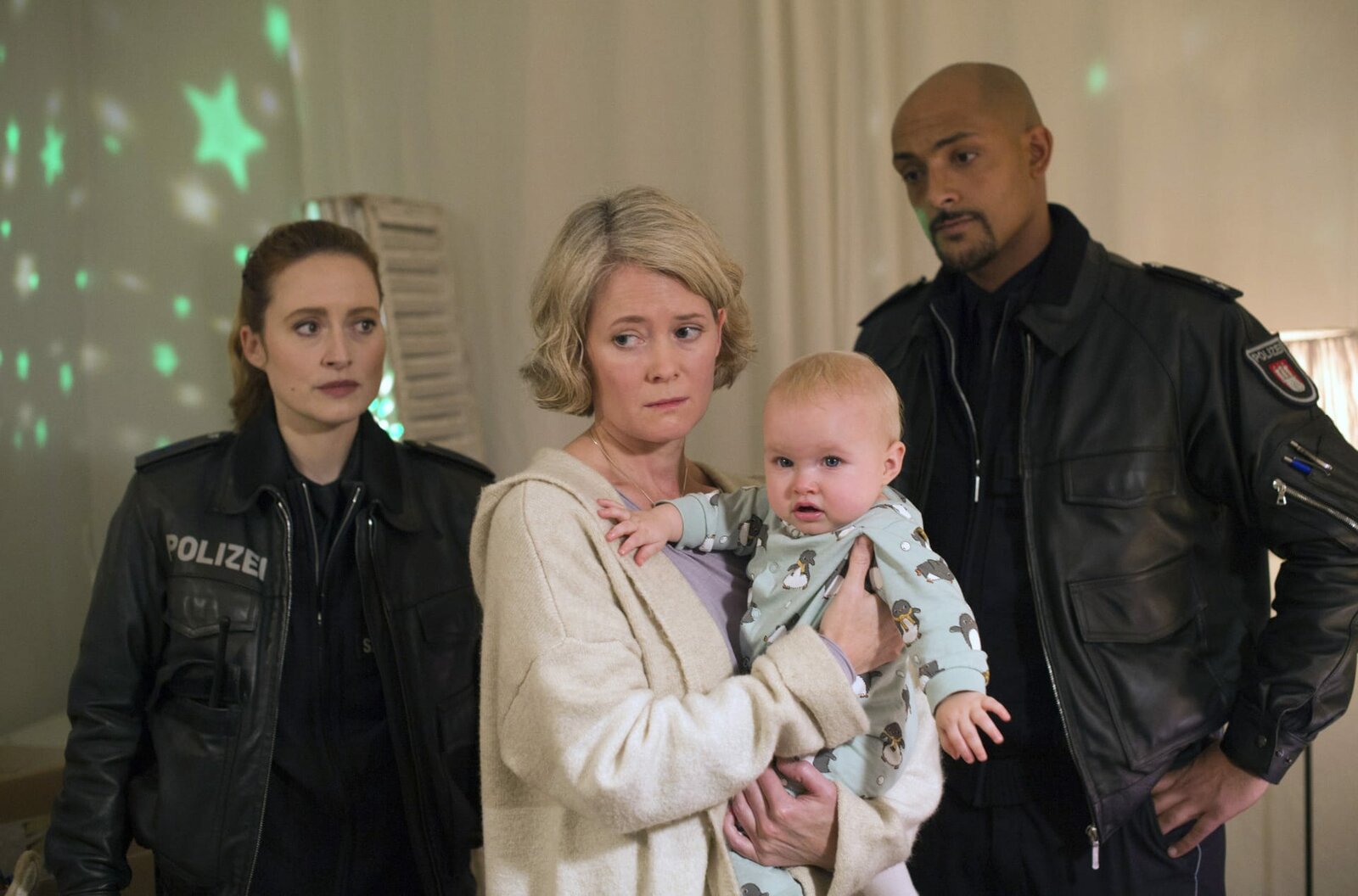 RettungskindNina Sieveking (Wanda Perdelwitz, l.) und Lukas Petersen (Patrick Abozen, r.) klingeln wegen einer Bagatelle bei Miriam Husmann (Lisa Karlström, M.) und entdecken bei ihr das am Morgen entführte Baby Elaine.Bild: © NDR/ARD/Thorsten Jander