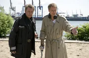 Verschollen im ParadiesDirk Matthies (Jan Fedder, l.) stellt einen aufgeregten Mann (Jörg Pilawa, r.) zur Rede, der auf dem von der Polizei abgesperrten Tatort mit einem Metallsuchgerät hantiert.Bild: © ARD/Thorsten Jander