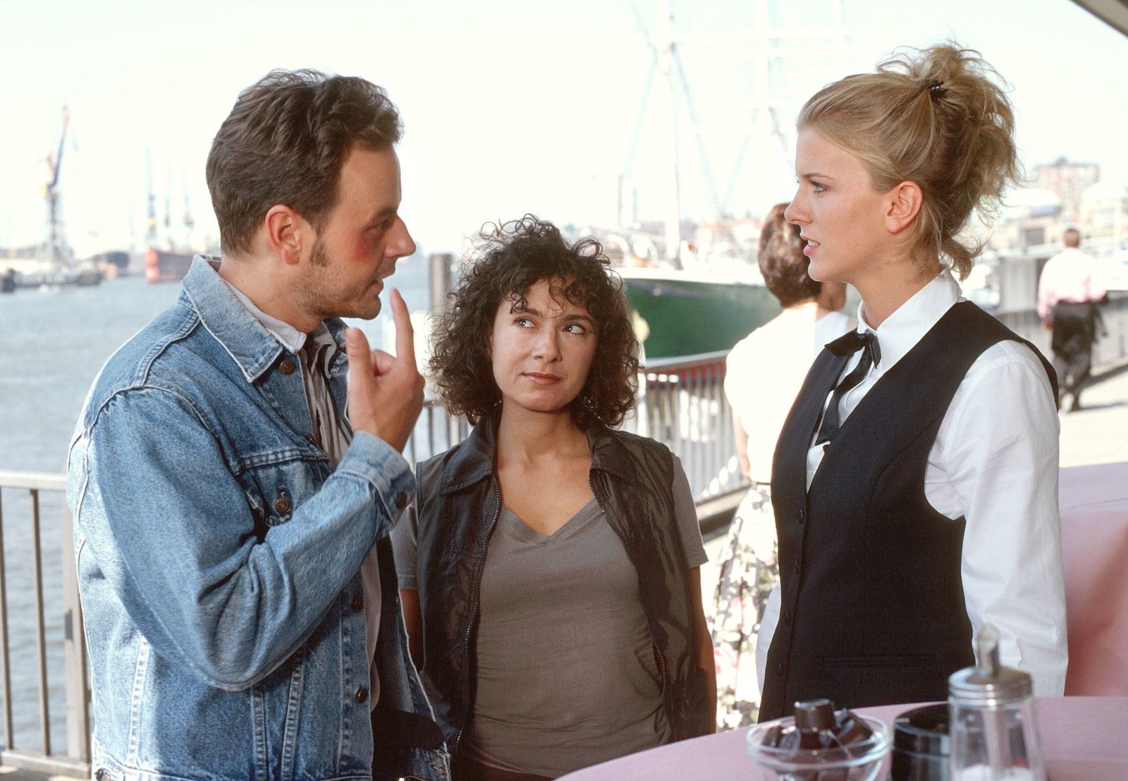 Der süße BetrugNDR Fernsehen GROßSTADTREVIER, "Der süße Betrug", am Mittwoch (24.06.15) um 22:00 Uhr. Henning (Till Demtröder, l.) und Harry (Maria Ketikidou, M.) stellen die hübsche Kellnerin Anita (Eva Habermann, r.) zur RedeBild: © NDR/ARD/Thorsten Jander