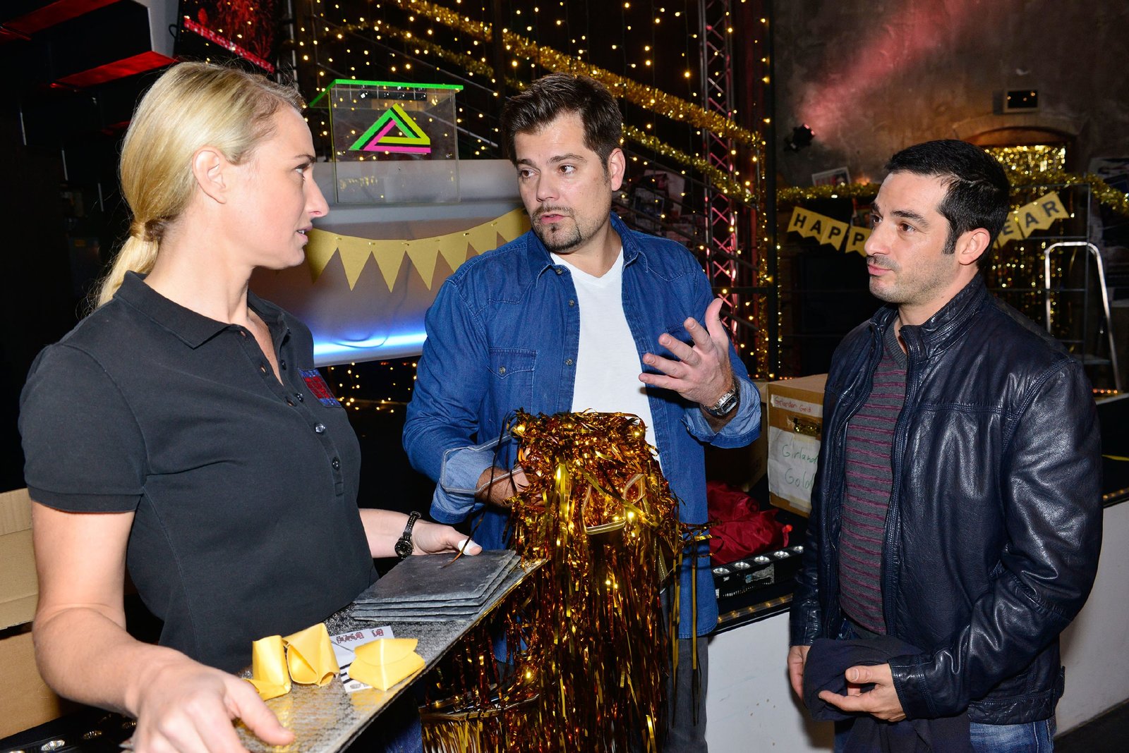 Sunny hält dicht und eilt zu Johanna ins KrankenhausNihat (Timur Ülker, r.) ahnt nicht, was sich hinter seinem Rücken abspielt. Links Tuner (Thomas Drechsel), in der Mitte Erik (Patrick Heinrich)Bild: © RTL / Rolf Baumgartner