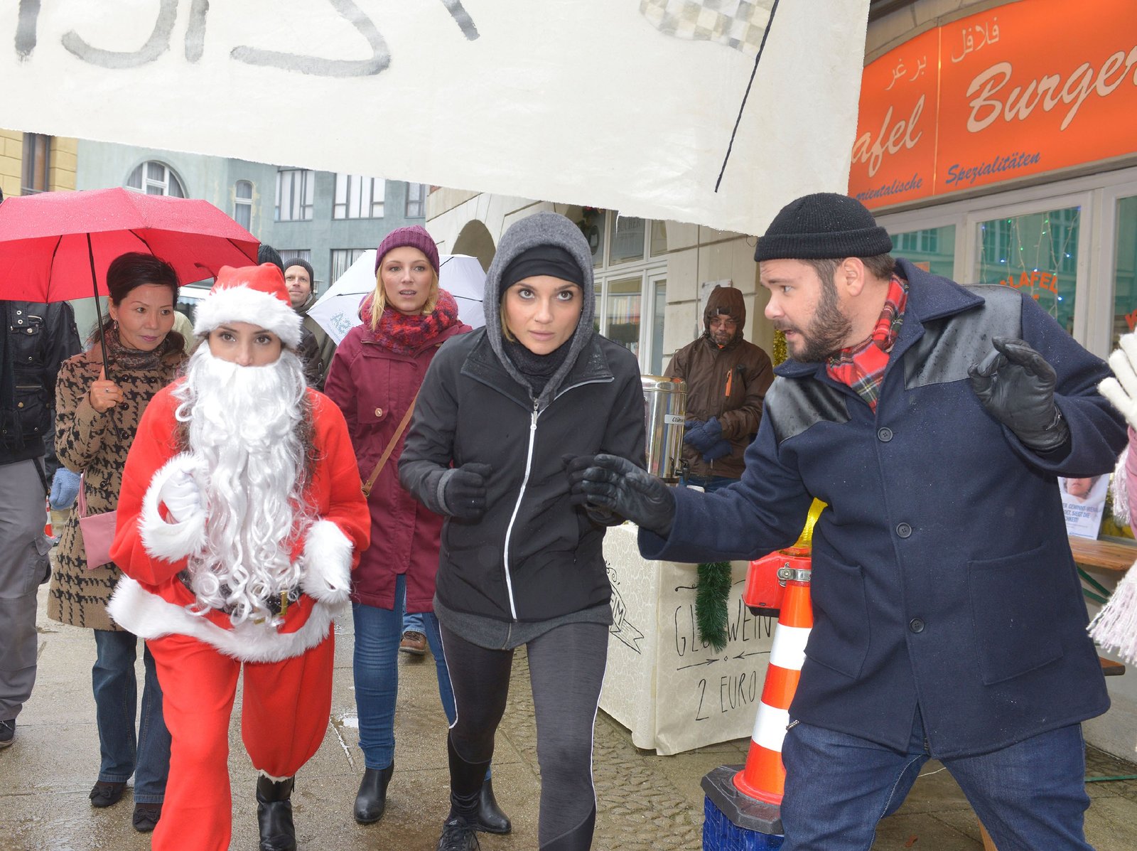 Alles für den guten ZweckTuner (Thomas Drechsel, r.) startet das Wettrennen zwischen Anni (Linda Marlen Runge, M.) und Ayla (Nadine Menz, l.) im Weihnachtsmannkostüm, aus dem Lilly (Iris Mareike Steen) einen Spendenlauf für ihre Sozialstation gemacht hat.Bild: © RTL / Rolf Baumgartner
