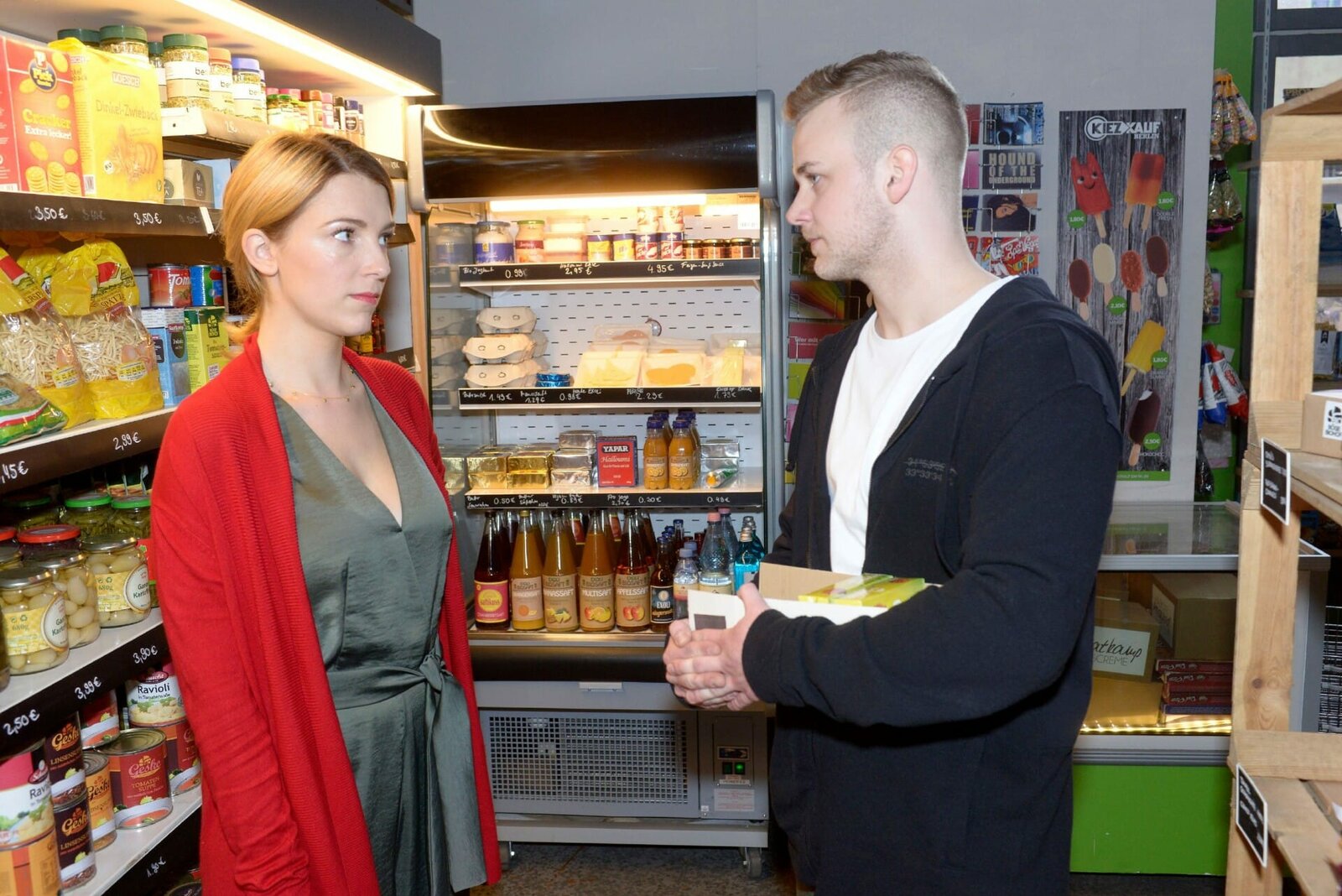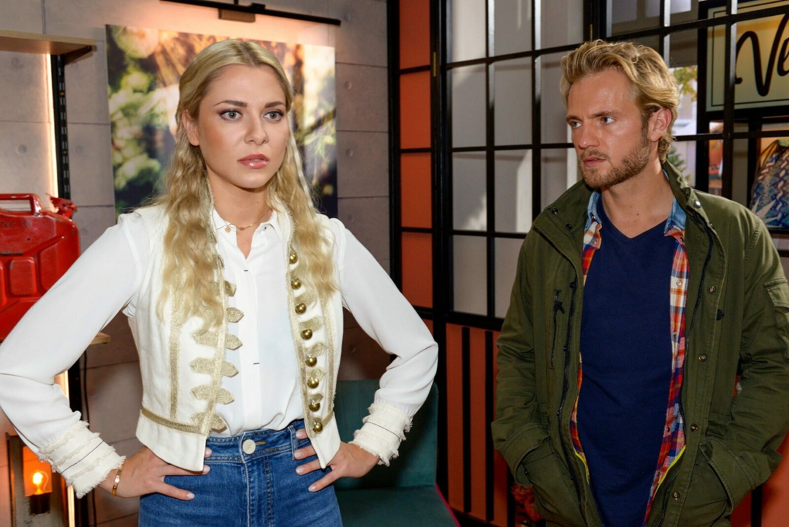 Nina wird klar, dass sie ihre Chance nutzen mussEmily (Anne Menden) und Paul (Niklas Osterloh) wundern sich über die lautstarken Nachbarn.Bild: © TVNOW / Rolf Baumgartner