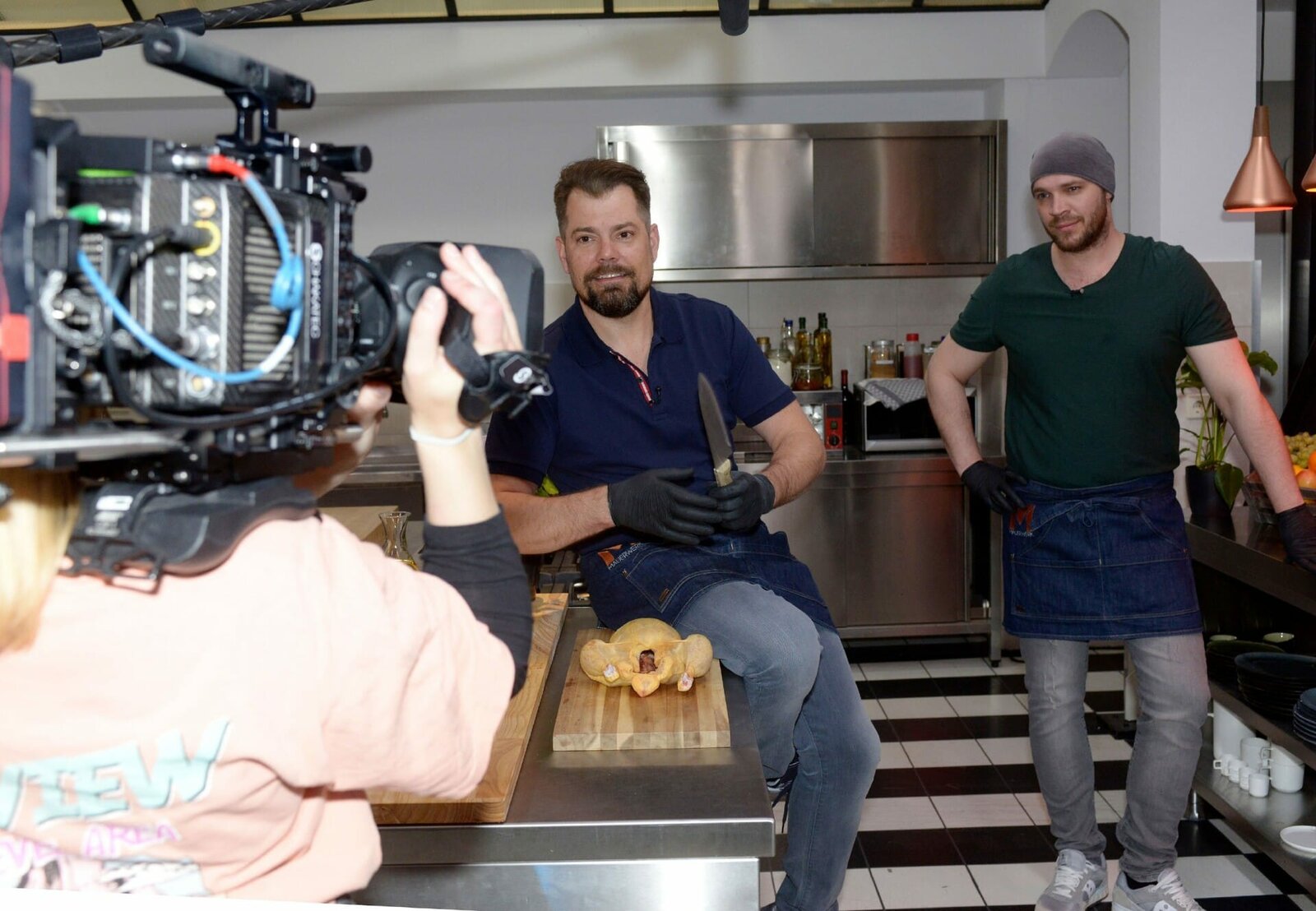 Jonas nimmt versehentlich DrogenDie Kochshow läuft gut und Leon (Daniel Fehlow, l.) ist froh, dass bei Erik (Patrick Heinrich) der Knoten geplatzt ist.Bild: © GZSZ Folge 7309 /