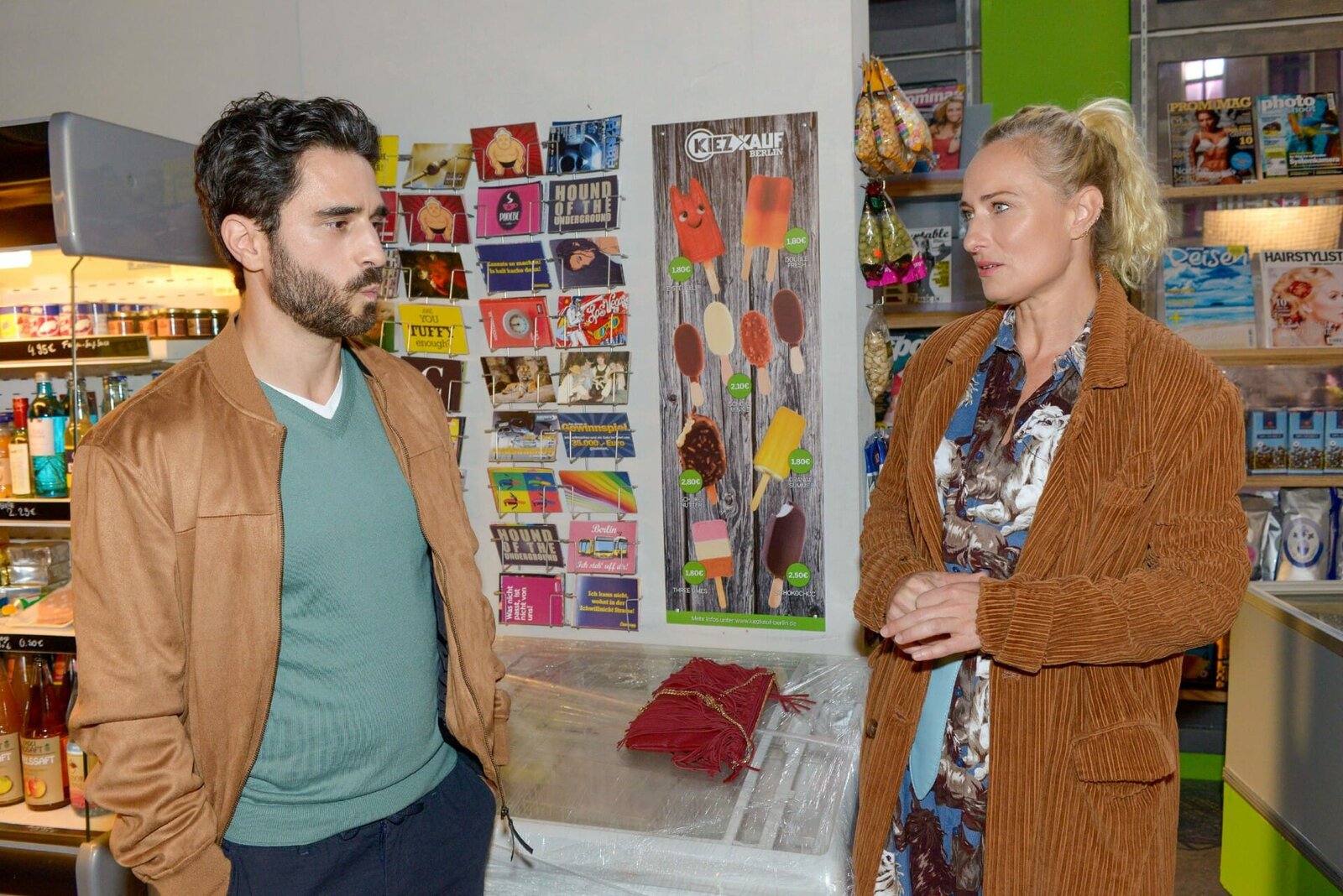 Nihat wartet sehnsüchtig auf eine Antwort aus DubaiJonas (Felix van Deventer) hört von Lilly (Iris Mareike Steen), dass sie bei Nihat offenbar einen Fehler gemacht hat.Bild: © TVNOW / Rolf Baumgartner