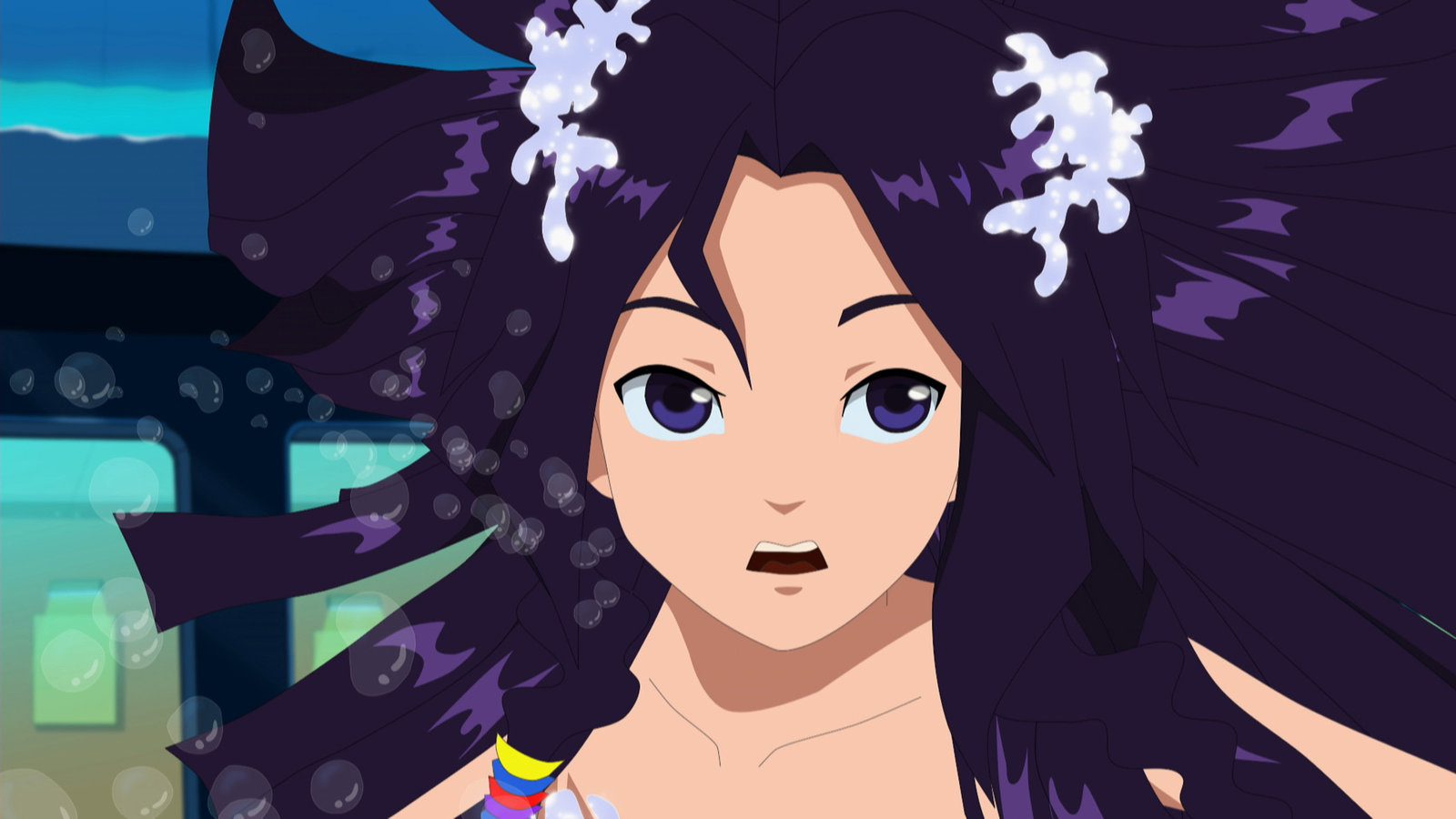 Die geheimnisvolle AlgeEmma (r.) ist unter Wasser mit einer geheimnisvollen Alge in Berührung gekommen. Seitdem verwandelt sie sich nicht mehr in eine Meerjungfrau wie ihre Freundinnen Cleo (1.v.l.) und Rikki (2.v.l.)Bild: © ZDF und Les Cartooneurs Associés