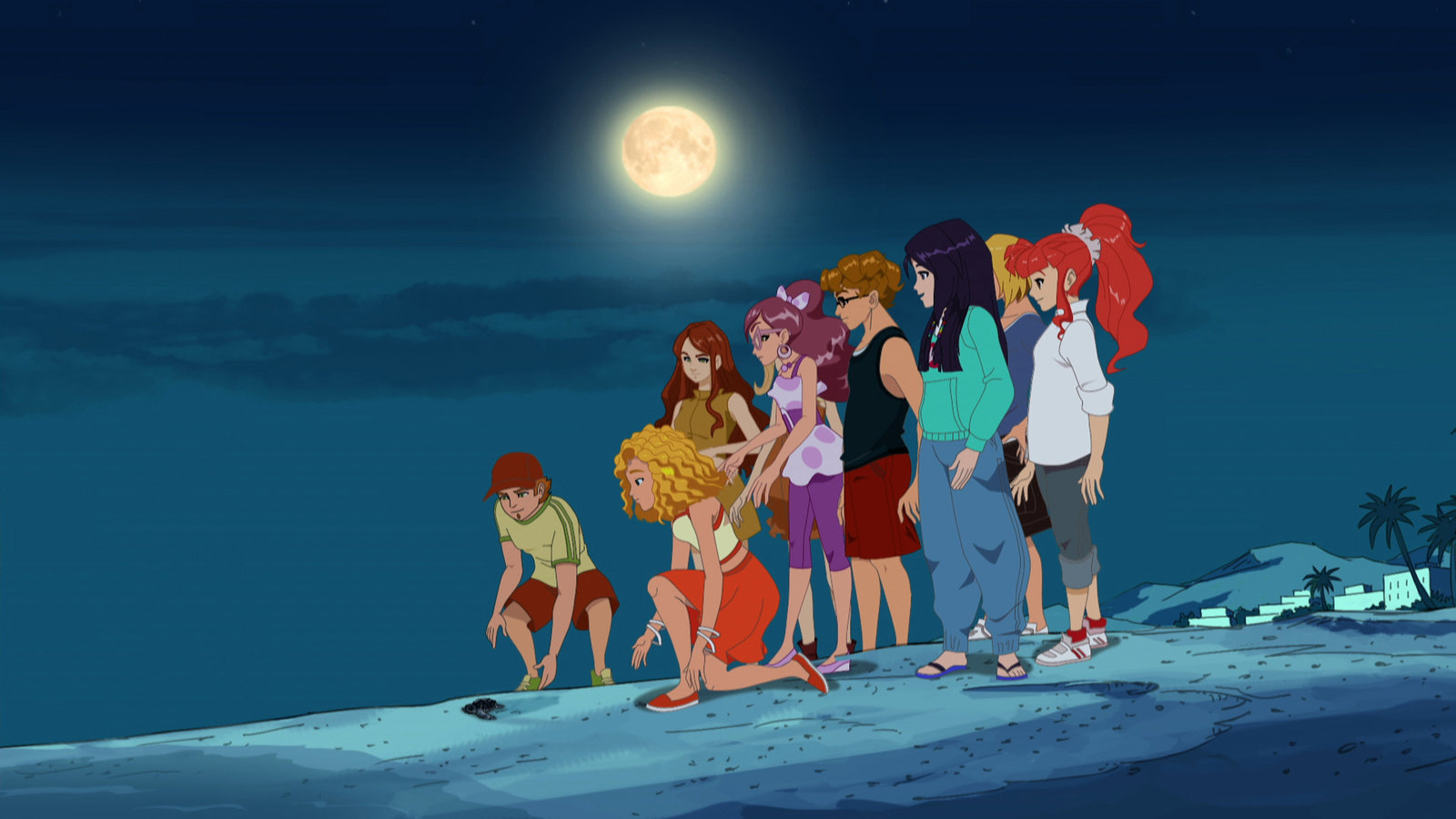 Das Geheimnis der Insel MakoRikki, Cleo und Emma im Mondsee auf der Insel Mako. Der Vollmond über ihnen scheint magische Kräfte zu besitzen.Bild: © ZDF und (c) Les Cartooneurs Associés