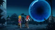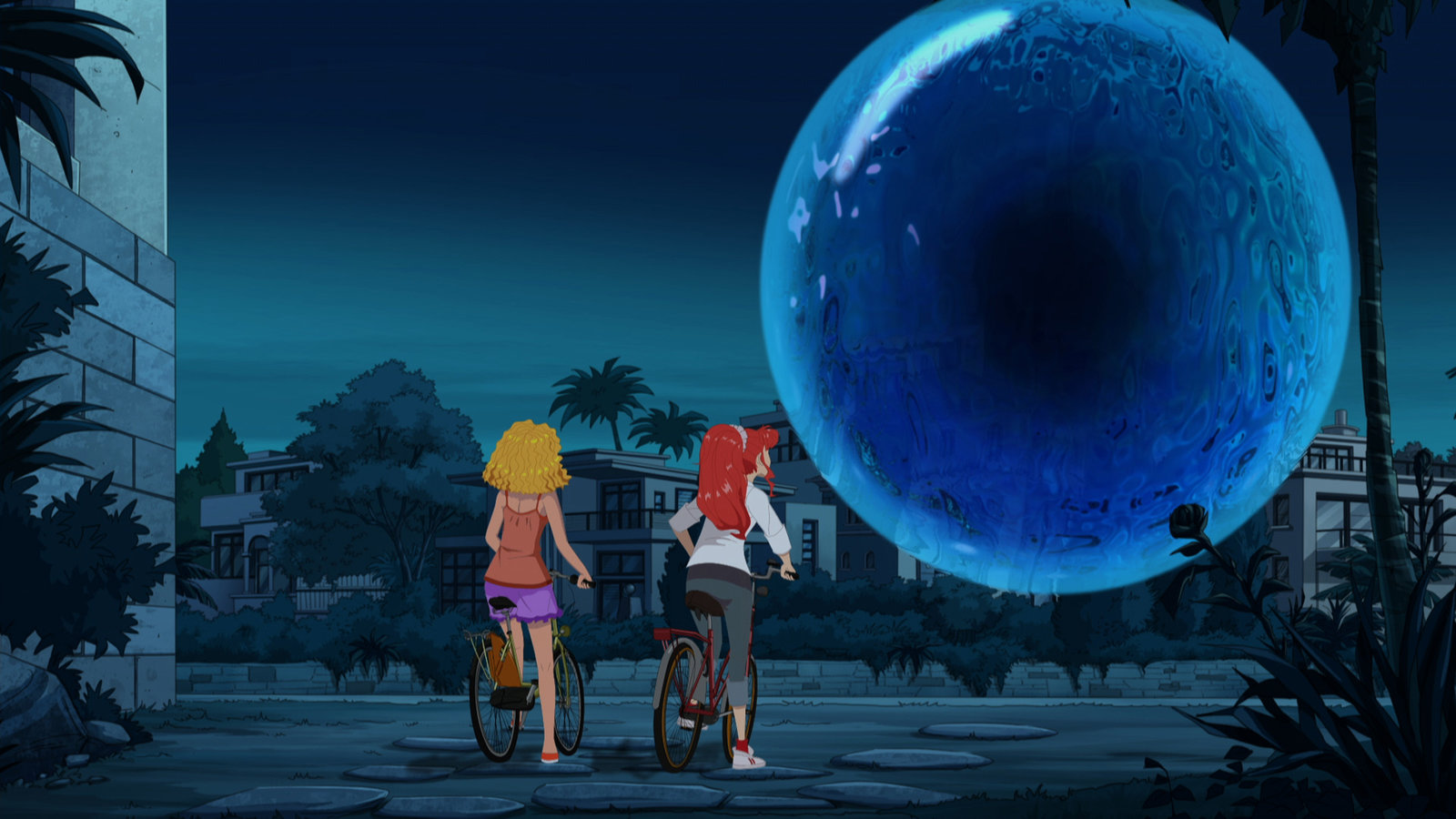 Ein seltsames PhänomenEine geheimnisvolle Kugel aus Wasser schwebt über der Stadt. Emma (l.) und Rikki (r.) verfolgen sie mit dem Fahrrad.Bild: © ZDF und Les Cartooneurs Associés