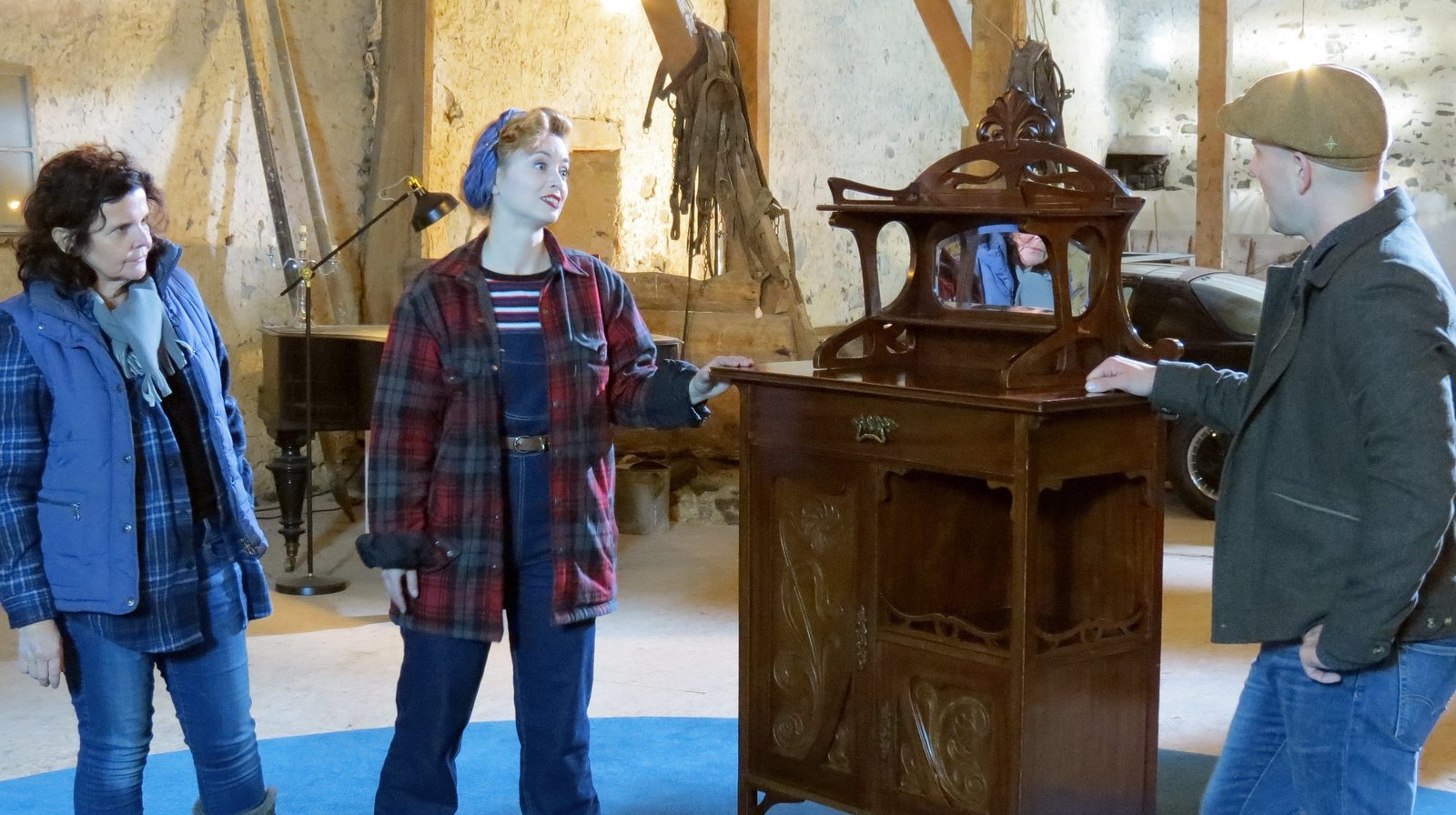 Schmucke IdeenRestauratorin Marion Gerhards (l) inspiziert zusammen mit Victoria Beyer (m) und Oli P. (r) ein altes Jugendstil-Vertiko.Bild: © WDR/Encanto Film- und Fernsehproduktions GmbH
