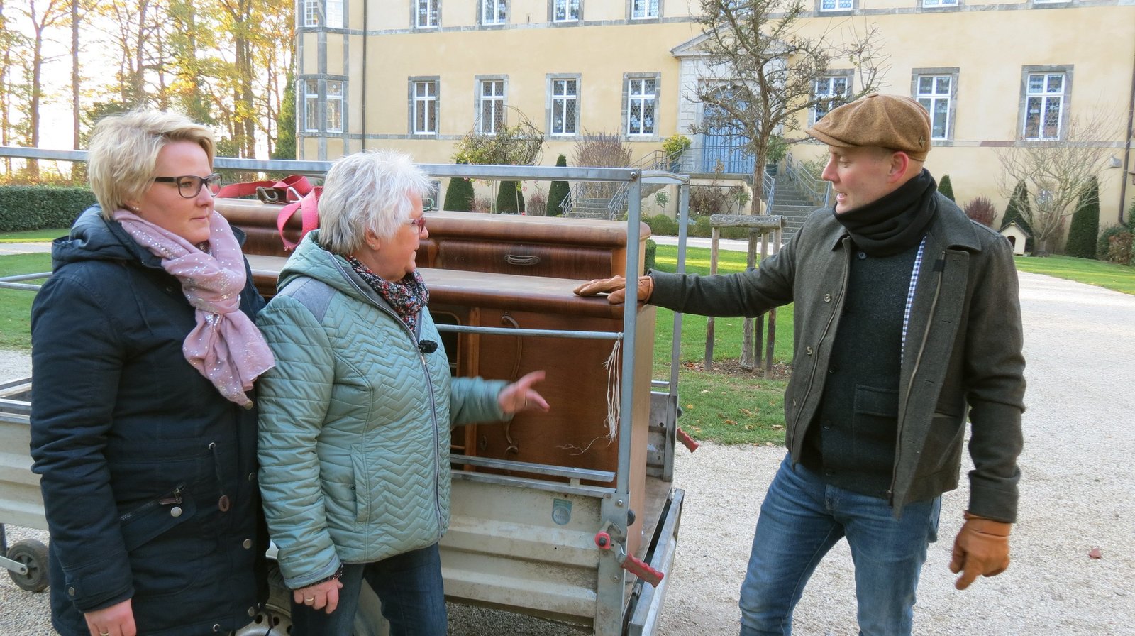 Von der Brosche zum AnhängerOli P. bekommt von Almuth (m) und ihrer Tochter Julia (l) ein altes Küchenbuffet.Bild: © WDR/Encanto Film- und Fernsehproduktions GmbH
