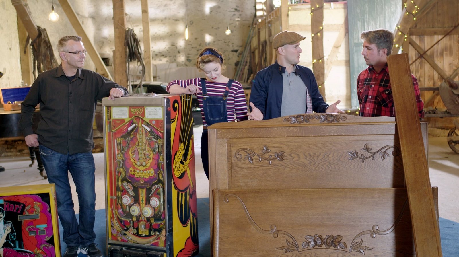Ein Holzbett wird zur SitzbankDie Experten Jeremias Immig (r) und Herick Maurer (l) müssen sich heute etwas für einen defekten Flipper und ein altes Bett einfallen lassen. Moderator Oli P. (2.v.r.) und seine Assistentin Victoria Beyer unterstützen bei der Ideenfindung.Bild: © WDR/Encanto Film- und Fernsehproduktions GmbH