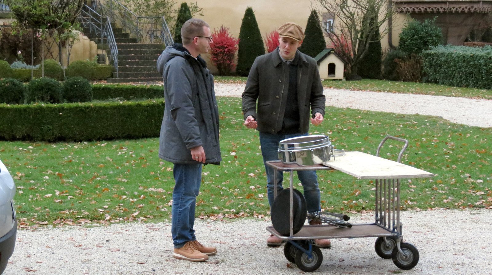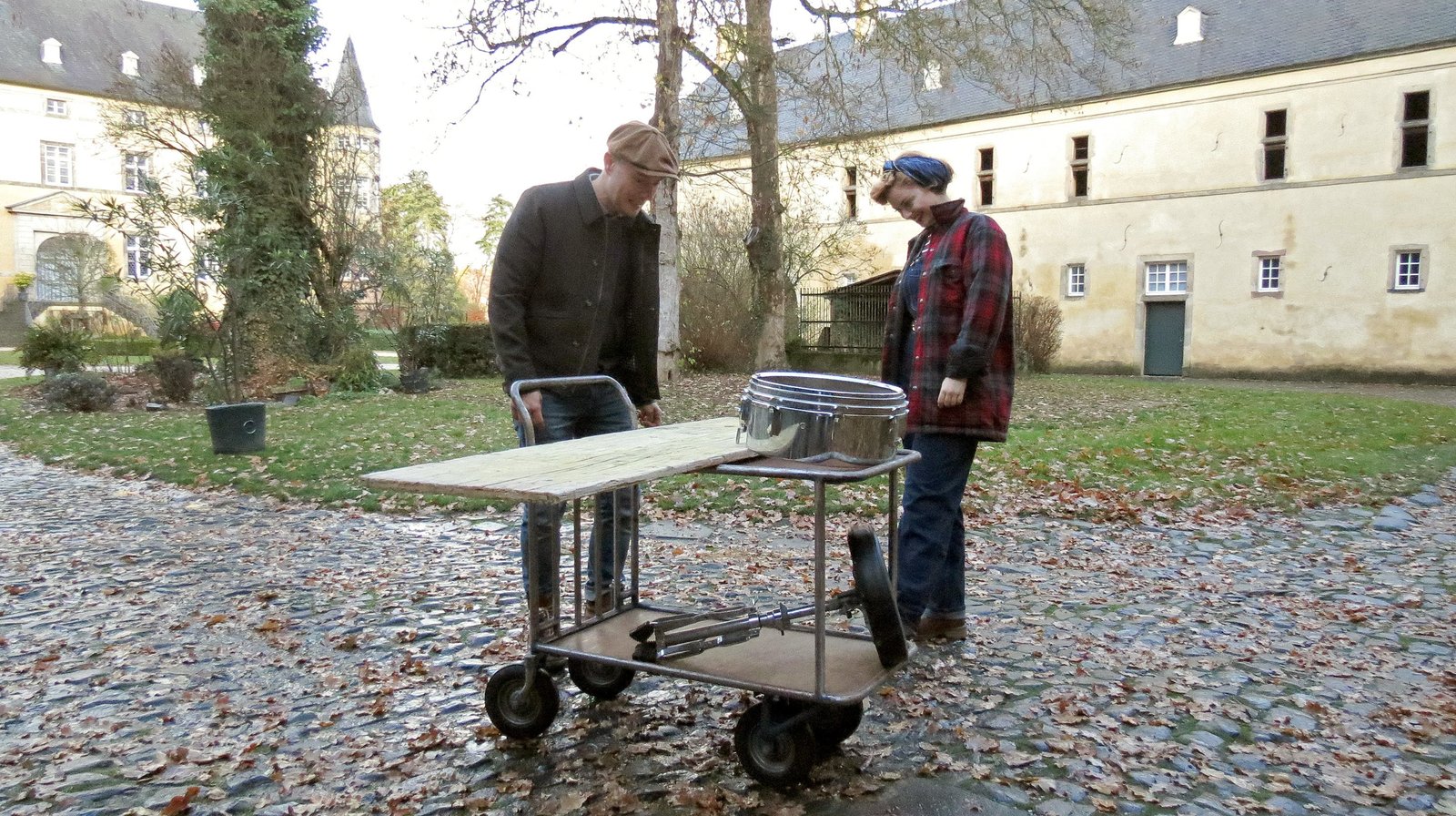 Schlagzeugtrommel zum WürstchengrillenChris (l) hat Oli P. eine Snare-Drum und ein altes Schalbrett mitgebracht.Bild: © WDR/Encanto Film- und Fernsehproduktions GmbH