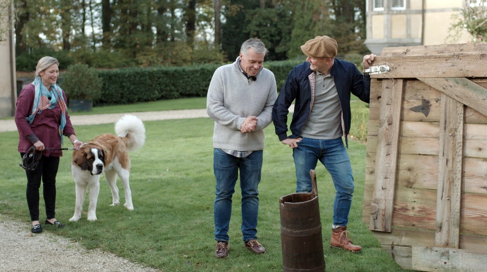 Der Hund in der TruheOli P. (l) inspiziert die große Truhe, die Haucke und Angela ihm mitgebracht haben.Bild: © WDR/Encanto Film- und Fernsehproduktions GmbH