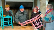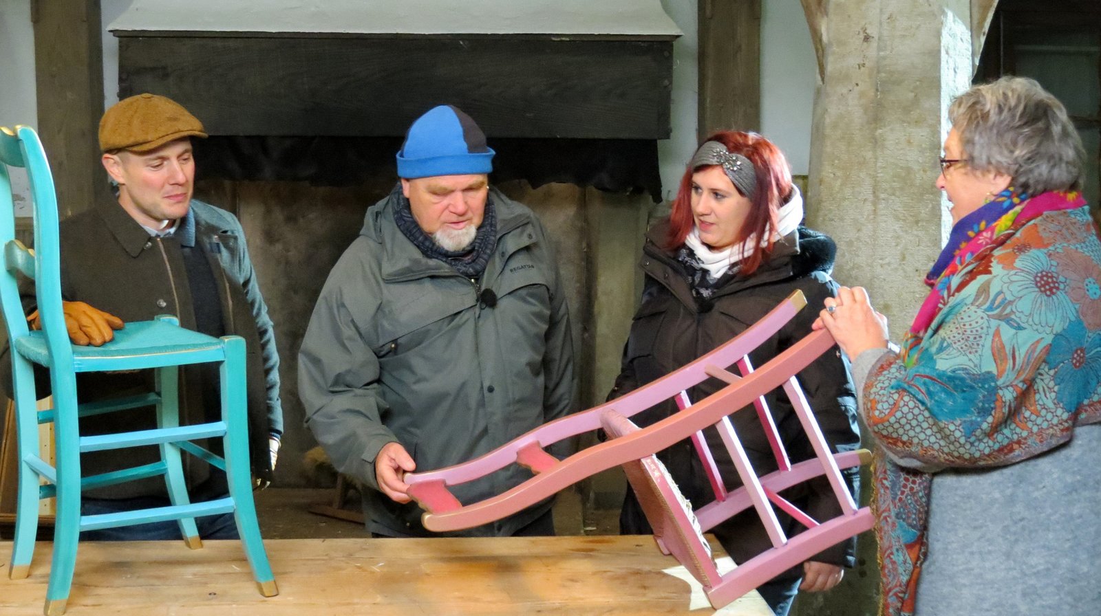 Die FlaschenlampeOli P. (l) staunt zusammen mit Bernd und Sarah, was Expertin Inge Thiemer-Schäffer (r) aus den alten Stühlen gemacht hat.Bild: © WDR/Encanto Film- und Fernsehproduktions GmbH