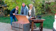Ein Grill, der sich gewaschen hatAndré (m) und Astrid haben Oli P. (l) die Einzelteile einer alten Holz-Waschmaschine mitgebracht.Bild: © WDR/Encanto Film- und Fernsehproduktions GmbH