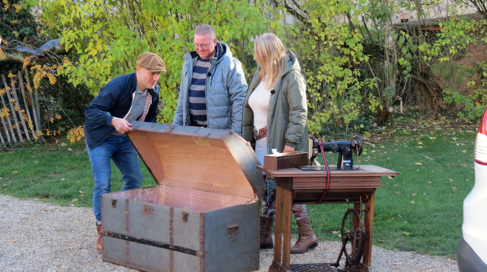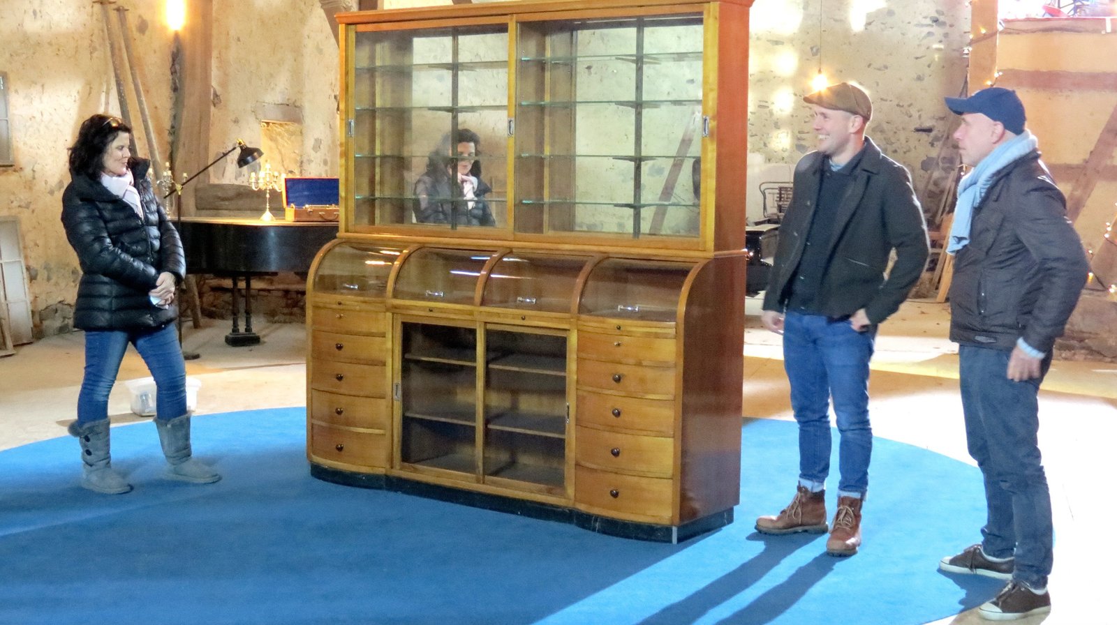 Der PalettentischV.l.n.r.: Susanne und Heiko aus Lindlar haben Oli P. ein riesiges Scheunentor und ein 160 Jahre altes Butterfass mitgebracht.Bild: © WDR/Encanto Film- und Fernsehproduktions GmbH