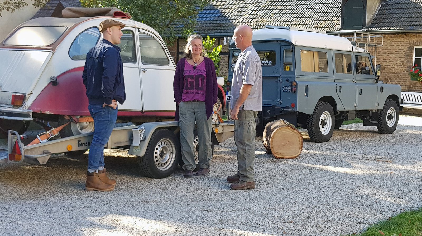 Ein Baumstamm als RegalKea (m) und Fritz Kern (r) haben Oli P. (l) ihre alte Ente mitgebracht. Ob sie noch zu retten ist?Bild: © WDR/Encanto Film- und Fernsehproduktions GmbH