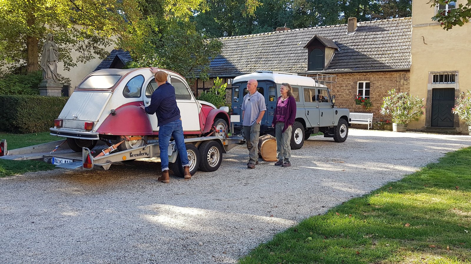 Ein Baumstamm als RegalKea (r) und Fritz Kern (m) haben Oli P. (l) ihre alte Ente mitgebracht. Ob sie noch zu retten ist?Bild: © WDR/Encanto Film- und Fernsehproduktions GmbH